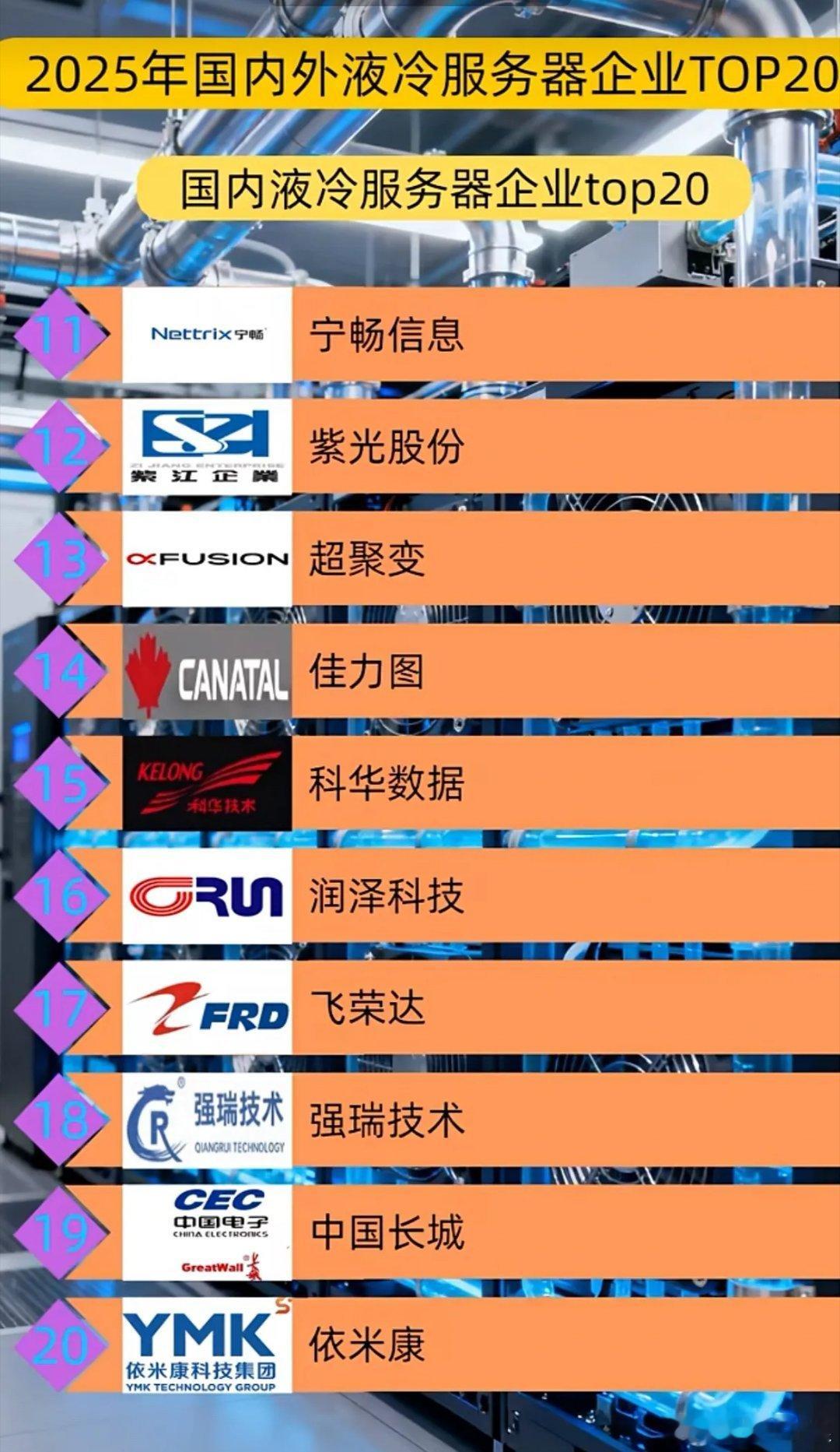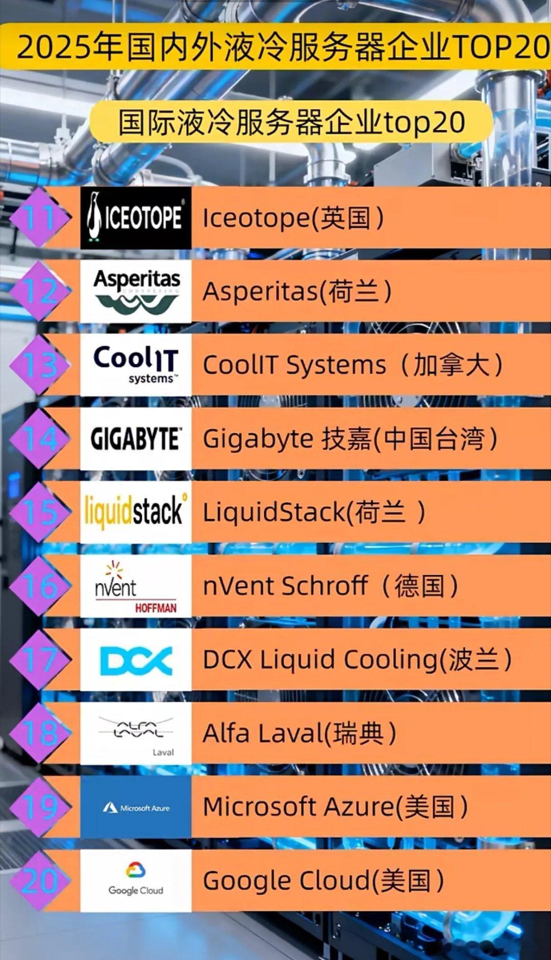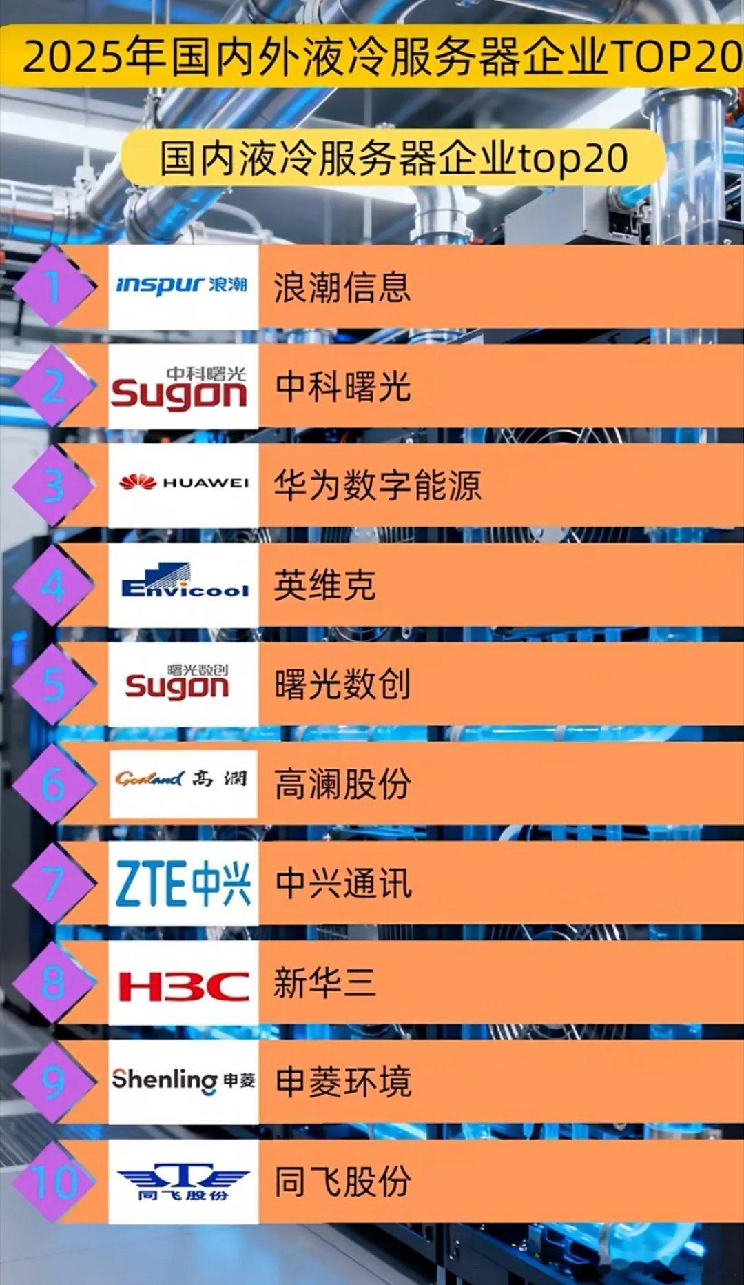 液冷服务器谁是“降温王者”?国内外头部企业已经把AI算力的“散热难题”拿捏了?液冷是AI算力的“降温刚需”,2025年的头部企业榜单里,国内外玩家已经分出了“技术势力范围”——国际巨头靠积淀领跑,国内企业凭本土化和性价比快速突围。先看国际阵营:美国Veritiv、法国施耐德、德国STULZ占据前三,这些企业靠多年的制冷技术积淀,垄断了全球高端液冷市场;IBM、戴尔等科技巨头也下场布局,连微软Azure、谷歌云都亲自下场做液冷服务,足见这一赛道的战略价值。再看国内阵营:浪潮信息、中科曙光稳居前二,华为数字能源、英维克紧随其后,这些企业不仅吃透了国内数据中心的液冷订单,还在技术上实现突破——比如曙光数创的浸没式液冷,已经能适配高密度AI服务器;高澜股份、同飞股份等专精企业,则靠细分领域的技术优势分到蛋糕。更关键的是赛道逻辑:AI算力越猛,服务器发热越严重,液冷是解决“散热瓶颈”的最优解。国际企业胜在技术成熟度,国内企业赢在本土化服务与成本控制,比如华为数字能源的液冷方案,能和自家服务器、电源形成生态协同,这是国际厂商比不了的优势。现在液冷服务器的竞争,已经从“技术比拼”转向“生态绑定”——不管是国际巨头还是国内玩家,能跟上AI算力增长节奏、绑定头部客户的企业,才能在这波散热红利里站稳脚跟。