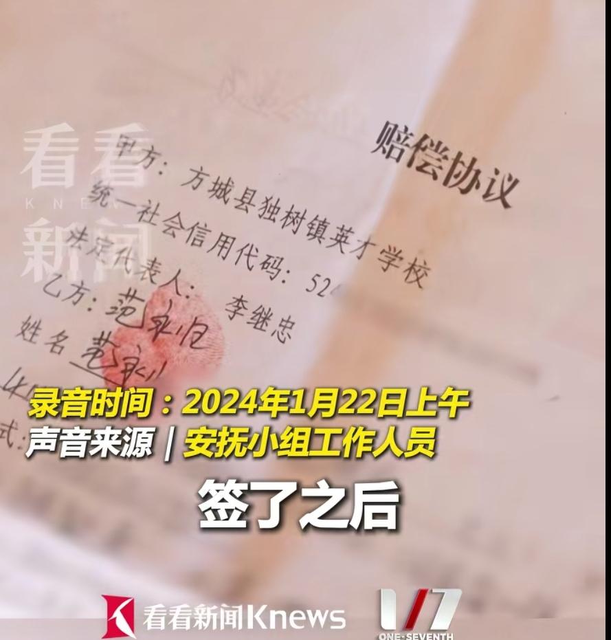 这赔偿协议简直是往家属心口上撒盐!不签字见不着孩子遗体,晚一天签,赔偿就少十万,签了还得承诺“不诉不访不主张权利!13个9岁的娃,在河南方城英才学校的宿舍火里没跑出来,这事过去快两年了,家属还没缓过来,又被校方递来的赔偿协议往心口扎了一刀。 2024年那场火,现在看来是人祸,32个孩子挤在56平的宿舍里,疑似电路老化加电暖器起火,宿舍门可能反锁、窗户封着防护栏,连个灭火器都见不着。13个娃就这么躺在各自床上没了,平均年龄才9岁。当时官方说成立家属服务专班、依法依规赔付,结果转头就拿孩子的遗体当谈判砝码,是人干的事儿吗? 家属这时候要的是钱吗?孩子得走得明明白白,是该担责的人蹲监狱,可校方偏要把赔偿变成封口费! 娃活着的时候,校方把安全当空话,娃没了,又把赔偿当工具。说到底,这协议不是钱的事,是对生命的轻贱,13个娃的命,在有些人眼里,不过是能用钱了结的麻烦。可家属的痛是一辈子的,他们要的是真相、是追责,不是揣着带血的钱,憋着一肚子委屈闭嘴。
