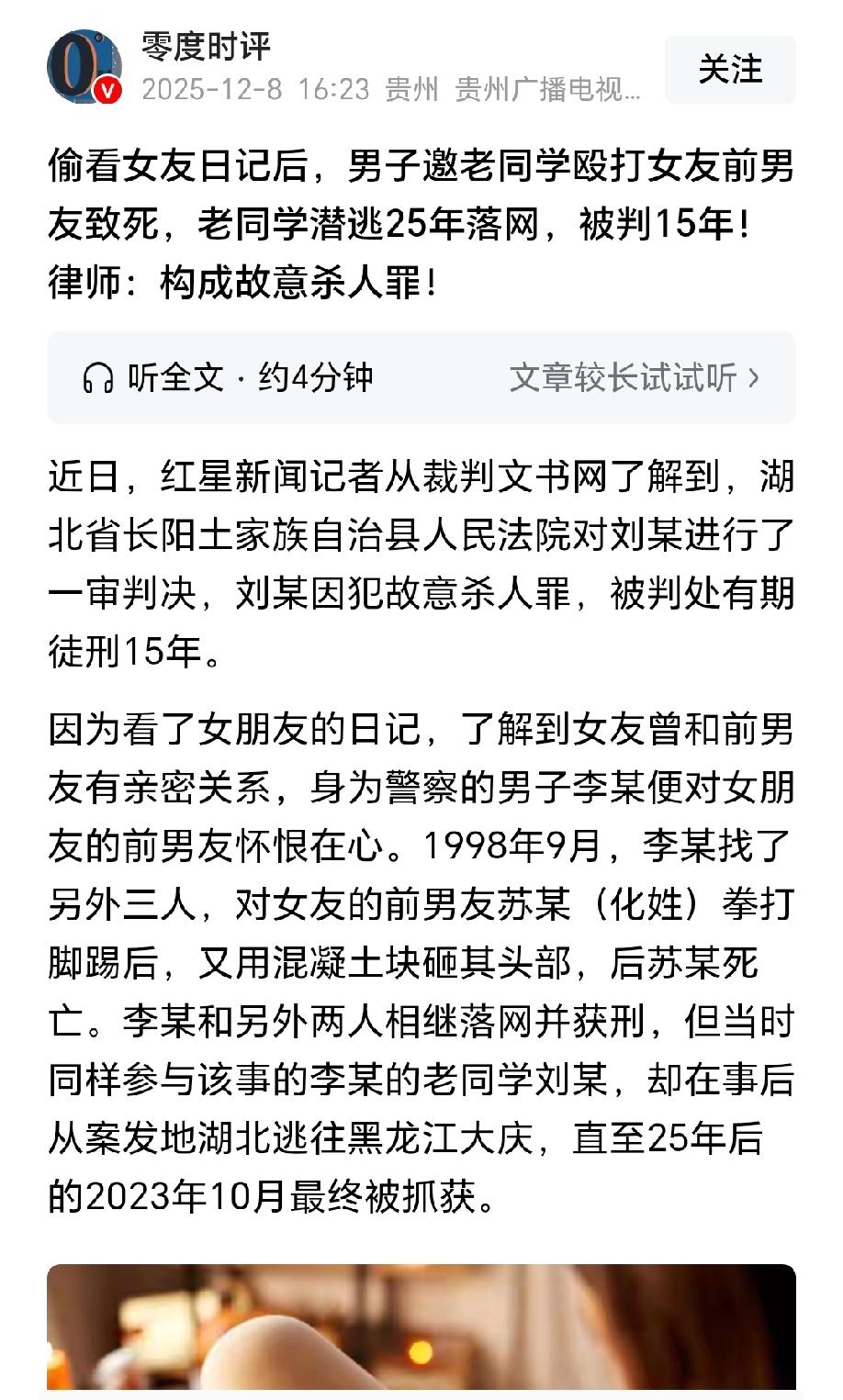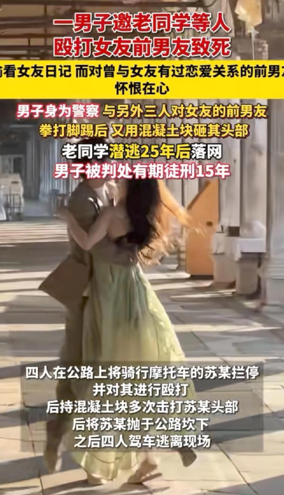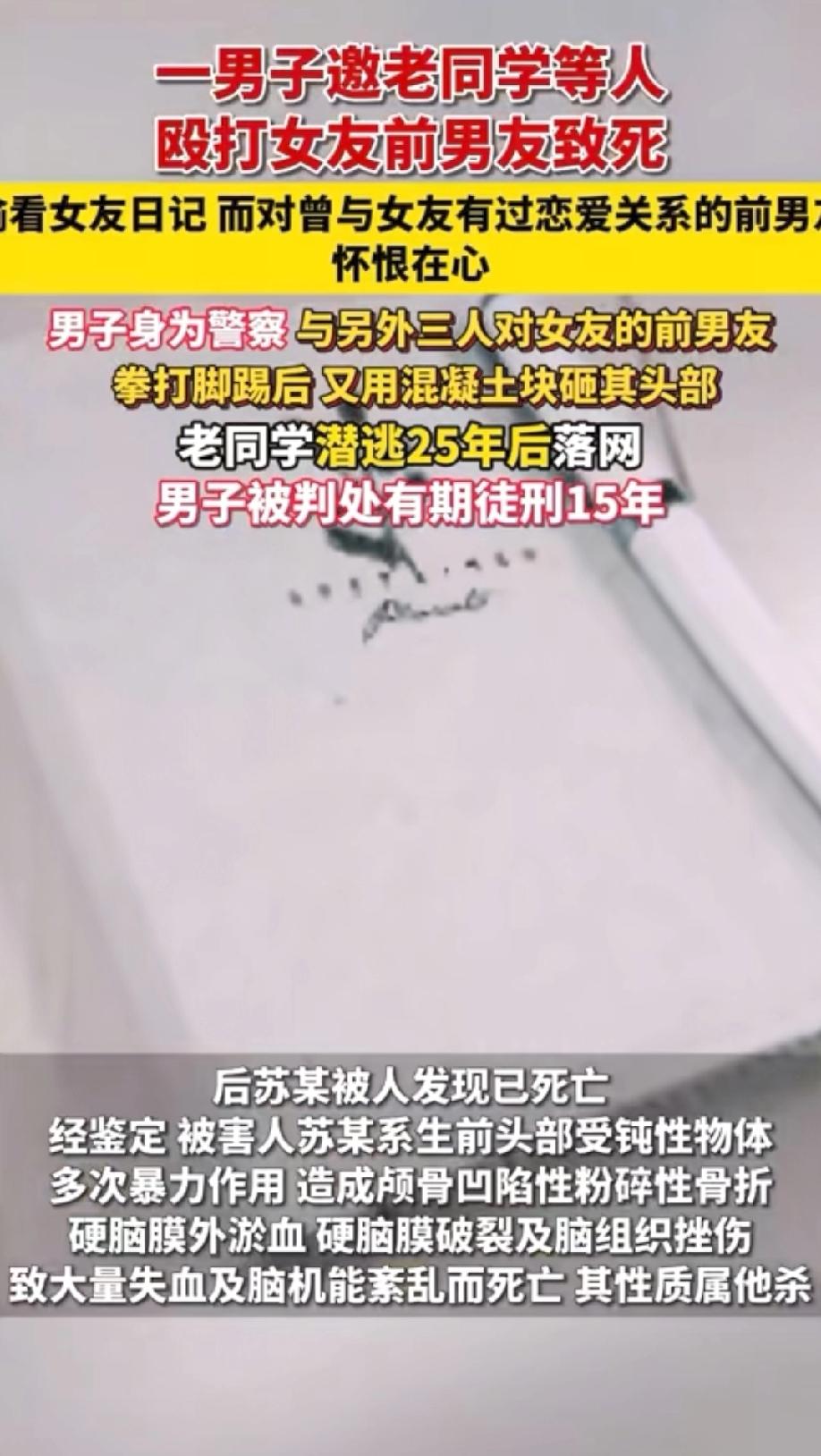 都是日记惹的祸!湖北宜昌,男子偷看女友日记,得知女友和前男友有过亲密关系,他因此对前男友怀恨在心。仇恨的种子一旦种下,男子更加痛苦,于是约了三个老同学,一起去殴打前男友,结果下手太狠,直接把前男友殴打致死。事后,男子和两个老同学相继落网并入狱,只有一个老同学销声匿迹。法网恢恢,疏而不漏,老同学潜逃25年后,终究还是落网,他主动给前男友家属赔偿25万后,法院这样判。 1998年,当时身为警察的李某本该守着一身正气过日子,可一段藏在日记里的过往,彻底搅乱了他的生活,也毁了他和老同学的人生。 这一切都源于李某的女友,以及女友的日记本。 李某和女友交往时感情一直挺好,可某天一时好奇,他竟偷偷翻看了女友的私人日记,没成想这一翻,翻出了让他满心膈应的秘密。 原来,女友之前和前男友苏某处过对象,两人还有过亲密关系。 原本就占有欲极强的李某,看完日记后心里像扎了根刺,越想越憋屈,对素未谋面的苏某恨得牙痒痒,总觉得对方占了自己的便宜。 这份恨意一天天攒着,压得他喘不过气,满脑子只剩报复的念头。 李某没想着跟女友好好沟通,也没反思自己偷看日记的错,反倒琢磨着找帮手教训苏某,非得出这口恶气才甘心。 很快,李某就联系上了自己的三个老同学,添油加醋地说苏某欺负了自己在意的人,撺掇着几人跟他一起找苏某算账,还承诺事后不会亏待大家。 几个老同学也很仗义,念着多年的情谊,又架不住李某的劝说,脑子一热就答应了。 刘某便是其中之一,他当时只以为就是普通的打架出气,压根没料到后续会酿成无法挽回的大祸。 1998年9月17日这天,李某带着刘某等三人提前摸清了苏某的出行路线,在一条公路上等着。 没多久,看见苏某骑着摩托车过来了,四人立刻开车上前,硬生生把苏某拦停在路边。 苏某还没反应过来怎么回事,李某就带着人冲了上去,对着他拳打脚踢,苏某疼得连连求饶,可被怒火冲昏头的几人根本没停手。 打了一阵,李某仍觉得不解气,瞥见路边的混凝土块,竟捡起来朝着苏某的头部砸去。 刘某和另外两人也跟着红了眼,上手继续殴打,还轮流拿混凝土块往苏某头上招呼,一下下都没留情。 苏某很快就没了反抗的力气,倒在地上没了动静,几人这才慌了神。 可事已至此,只能硬着头皮把苏某拖到公路坎下扔着,随后赶紧开车逃离了现场。 后来有人路过发现了苏某,可他早已没了生命体征,经鉴定,苏某是因为头部多次被钝性物体击打,颅骨碎了、脑组织受了重伤,又流了大量的血,最终没撑过去,妥妥的他杀。 案发后警方很快就锁定了嫌疑人,李某和另外两个参与殴打苏某的老同学没多久就被抓了,各自被判了刑。 唯有刘某吓得魂飞魄散,他看着同伙落网,心里又怕又慌,连夜从宜昌逃到了黑龙江大庆,从此隐姓埋名,不敢跟家人联系,也不敢暴露自己的身份,过着提心吊胆的日子。 这一逃就是二十五年,刘某在大庆躲躲藏藏,每天都担心警察找上门,夜里常被当年打人的画面惊醒,日子过得煎熬又压抑,可他始终没敢主动投案。 直到2023年10月,警方通过不懈追查,终于在大庆找到了刘某,将他成功抓获,这桩尘封二十五年的命案,总算等来了所有涉案人员落网的时刻。 被捕后的刘某,一开始自愿认罪,可到了庭审时,却对自己当年的主要犯罪行为遮遮掩掩,说的话也是前后矛盾,也没法给出合理的解释。 他的家人看着他落网,也知道错已铸成,主动找到苏某的家属,赔了二十五万元,总算得到了对方的谅解。 刘某不知道,躲藏了25年,还是没能躲过追诉时效。 《刑法》第八十七条规定:法定最高刑为无期徒刑、死刑的,经过二十年。如果二十年以后认为必须追诉的,须报请最高人民检察院核准。 本案中刘某涉嫌故意杀人罪,该罪法定最高刑为死刑,对应的一般追诉期限为二十年。案件发生于1998年9月,若不存在法定例外情形,至2018年9月追诉期限即届满,司法机关无权再对刘某追究刑事责任。 但结合案件实际情况,刘某的行为符合追诉期限延长的法定条件,不受二十年期限限制。 《刑法》第八十八条规定:在人民检察院、公安机关、国家安全机关立案侦查或者在人民法院受理案件以后,逃避侦查或者审判的,不受追诉期限的限制。 案发后公安机关迅速锁定包括刘某在内的四名嫌疑人,随即立案侦查,刘某为逃避法律制裁,连夜从宜昌潜逃至黑龙江大庆,隐姓埋名长达25年,属于立案侦查后逃避侦查的情形。 因此,只要司法机关已立案侦查,犯罪嫌疑人实施逃避侦查行为,就不再受原有追诉期限约束,无论经过多长时间,司法机关均有权对其追究刑事责任。 最终,法院认定,刘某参与故意杀人的事实确凿,还是以故意杀人罪判处他有期徒刑十五年。 这二十五年的逃亡路,终究没能逃过法律的制裁,犯下的错,终究要付出沉重的代价。
