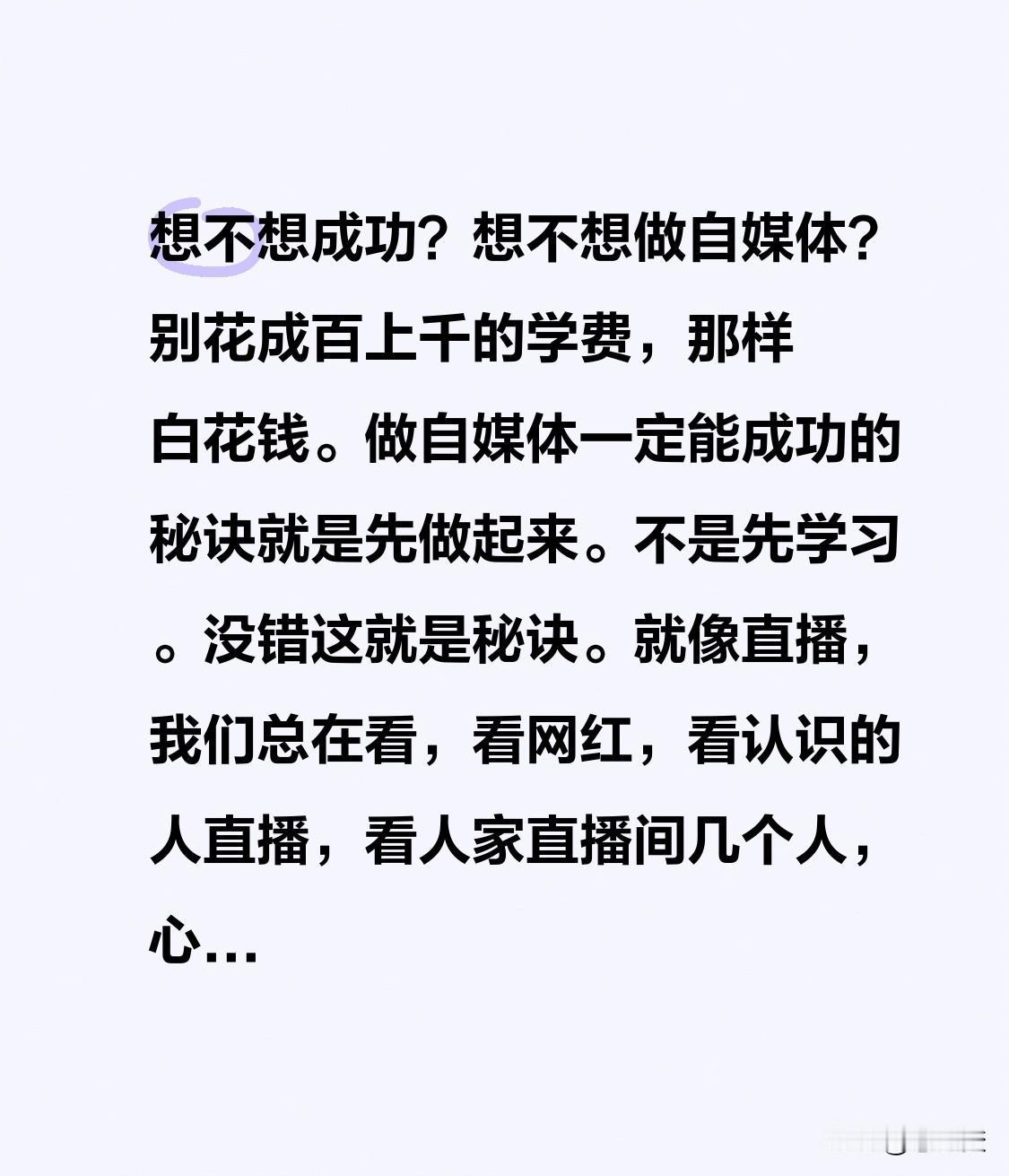 想不想成功?想不想做自媒体? 别花成百上千的学费,那样白花钱。做自媒体一定能成功的秘诀就是先做起来。不是先学习。 没错这就是秘诀。 就像直播,我们总在看,看网红,看认识的人直播,看人家直播间几个人,心里还挺得劲。等过两年再刷到熟人时,人家已经每天成交上千上万了。 立刻马上,行动! 欢迎交流!