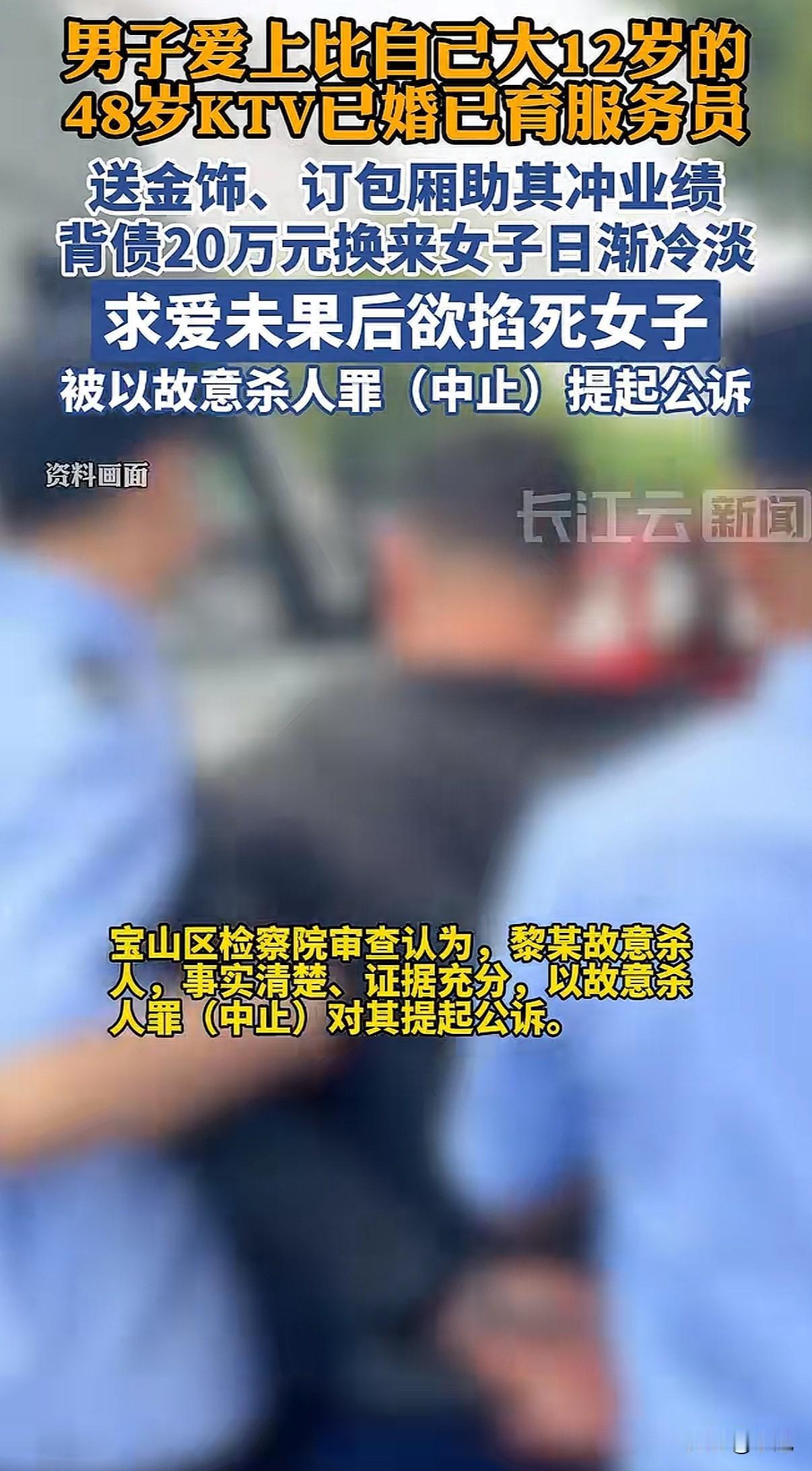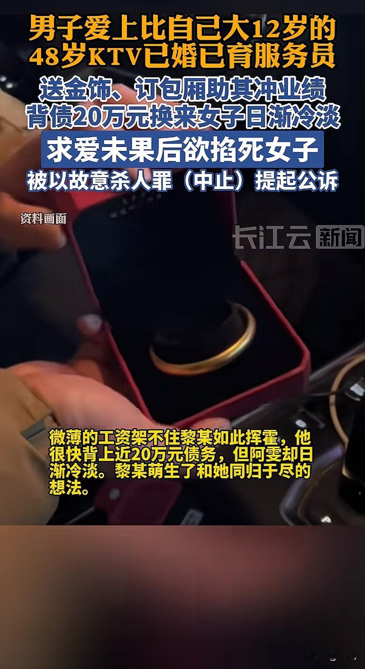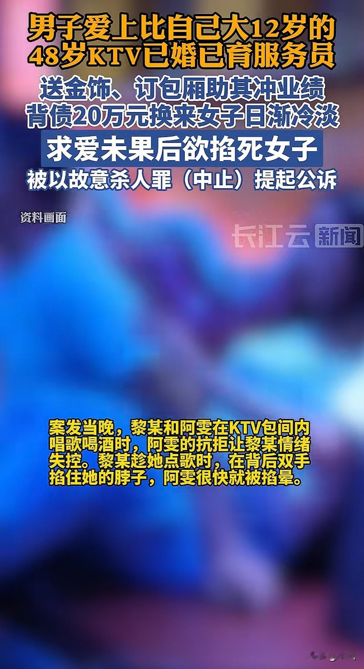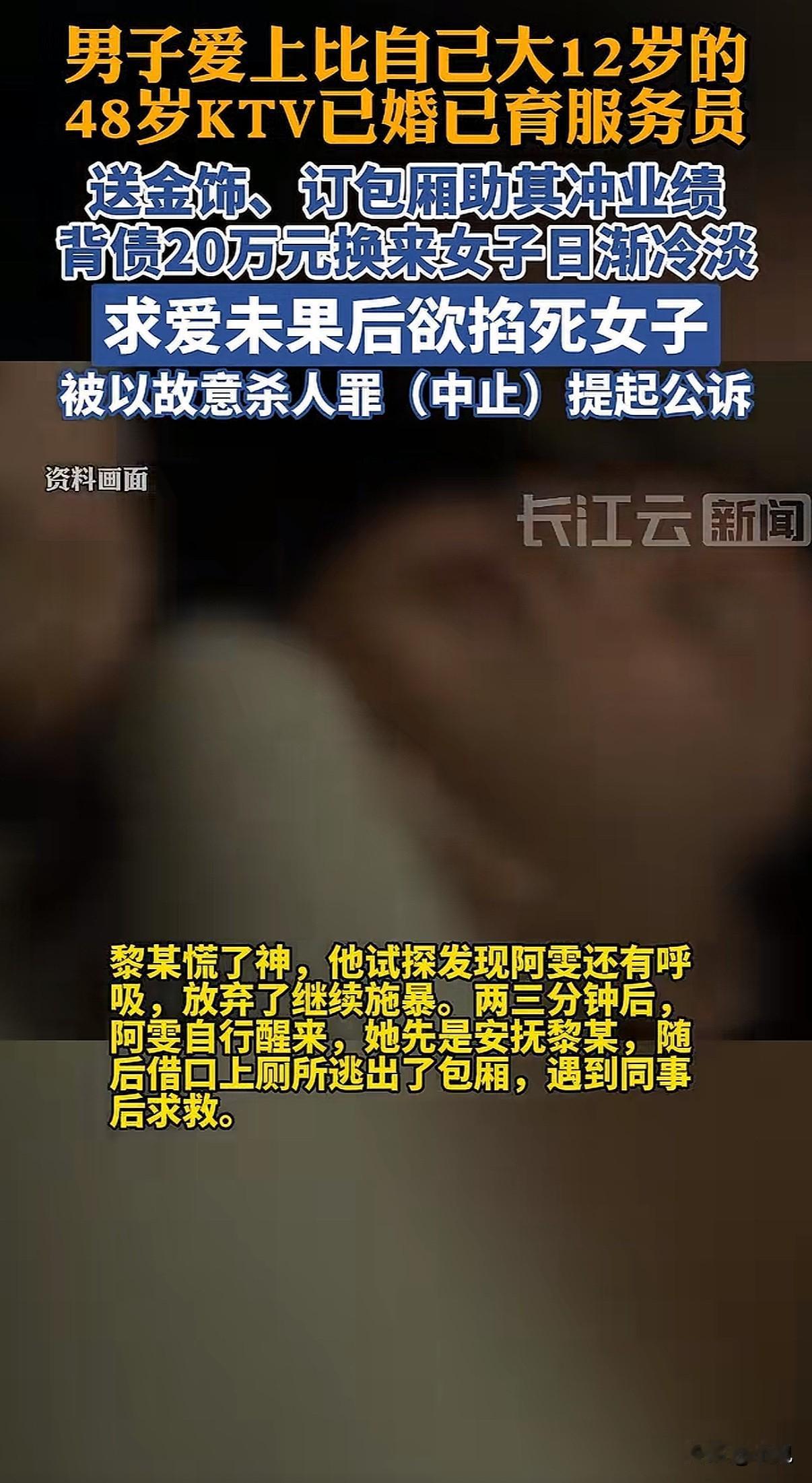 36岁的黎某,在KTV认识了服务员文某。女方48岁,已婚,有两个孩子。这些基本情况,黎某一开始就知道。 十几年没谈过恋爱的黎某,像是抓住了救命稻草。他开始疯狂示好。买黄金手链,买金项链,隔三差五带朋友去KTV,专门找文某订包间,让她赚提成。 他那点工资哪够这么花。跟朋友借,上网贷,三个月时间,背了快20万的债。可文某对他,始终爱搭不理。 案发那晚,在包间里,黎某想有些身体接触,文某表现得很反感。就是这份反感,成了压垮骆驼的最后一根稻草。 黎某趁文某背对着他点歌的时候,从后面,用双手死死掐住了她的脖子。两人体型力量差距太大,文某很快被掐晕过去。 掐了一会儿,黎某松手了。他发现文某还有呼吸,没下死手。他用一把椅子抵住了包间的门。 文某醒过来。她没敢激怒黎某。她对黎某说:“我没事,让我抱抱你。” 黎某没反应。文某又说:“你让我上个厕所吧。” 这次黎某让她去了。文某一出包间门,就拼命逃到走廊,遇到了同事赵某,这才得救。 民警赶到时,黎某手里拿着一把刀。他说:“我包里的刀,就是为了弄死她准备的。” 案子到了检察院。调查得很清楚。文某第一次见面就说了自己已婚,黎某送的礼物,她收了,但没主动要过,也没给过感情上的承诺。 从法律上讲,收礼物不犯法。关键看有没有骗。检方没找到文某欺诈的证据。 所以,黎某因为故意杀人(中止),被提起了公诉。 很多人看完,第一反应是,这男的太极端,太可怕。没错,暴力犯罪没得洗。 但静下来想想,这悲剧怎么酿成的? 一个36岁的男人,十几年没恋爱,心理状态可能本身就有一些孤寂和偏执。他把突然的心动,当成了全部。 KTV那种环境,逢场作戏是常态。他可能误解了职业性的陪侍和好感。他投入的不是感情,是沉没成本。钱越花越多,债越欠越深,却看不到回报,心态就崩了。 女方呢?站在她的角度,客人送贵重礼物,收不收可能都为难。收了,怕对方误会;不收,可能得罪客人影响工作。她可能也没想到,对方会极端到这个地步。 这不只是情感纠纷,更像是一个社会切片。里面有长期情感压抑的爆发,有对消费和物欲的误解,有特定工作环境下的模糊边界。 法律管行为。黎某动手了,就要负责。 但情理上的线,往往更模糊。成年人之间的交往,分寸感太重要了。尤其是涉及金钱和感情的时候。 单方面不计成本的付出,很多时候不是深情,是危险的偏执。而明知对方心意,却持续接受贵重馈赠,即便不违法,在人情上也埋着雷。 这案子没有赢家。一个面临刑期,一个身心受创。那近20万的债,到底买了什么?大概只买来一场两败俱伤的噩梦。