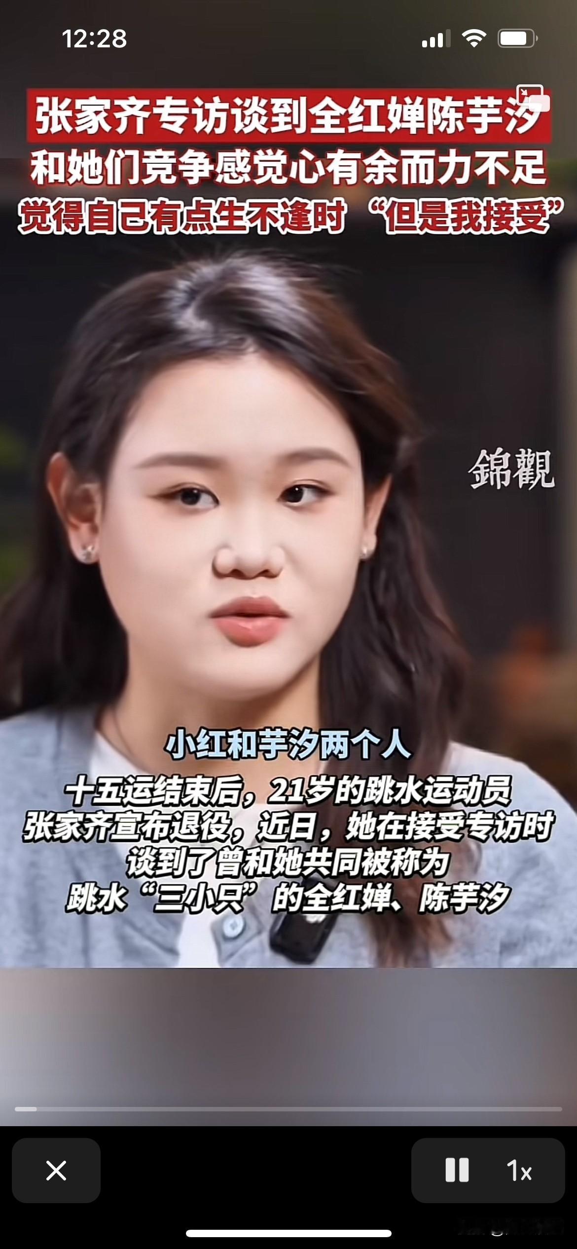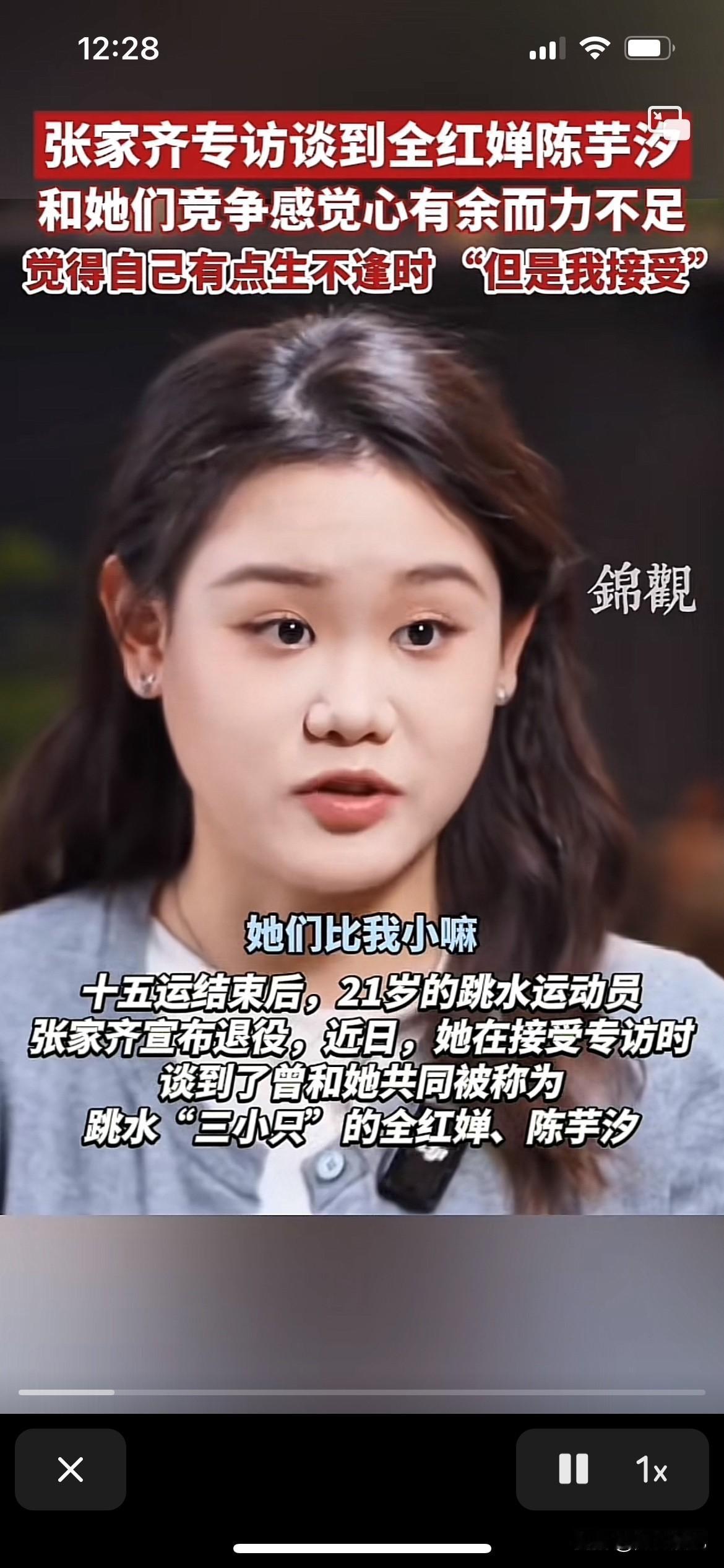 还是为张家齐感到惋惜,那么快就退役,只能说遇到两个强大的对手全红婵、陈芋汐,被迫无奈放弃自己的职业生涯,不过她并没有责怪,而且觉得自己生不逢时吧,个人素质很高,这么年轻格局就那么大,以后也会很有出息。 了解她的人都知道,为什么她运气差一点,她状态最好的时候,年龄差一岁不够参加奥运,等了四年年龄够了,奥运延期了,终于能参加奥运会了,她进入了发育期状态下滑,她整个巅峰时期都没赶上奥运周期,接受不接受也没办法。 蛮喜欢这孩子的,运动员时期也很谦逊,凡事都很谦让,希望退役后有好的未来才不辜负这个好孩子。