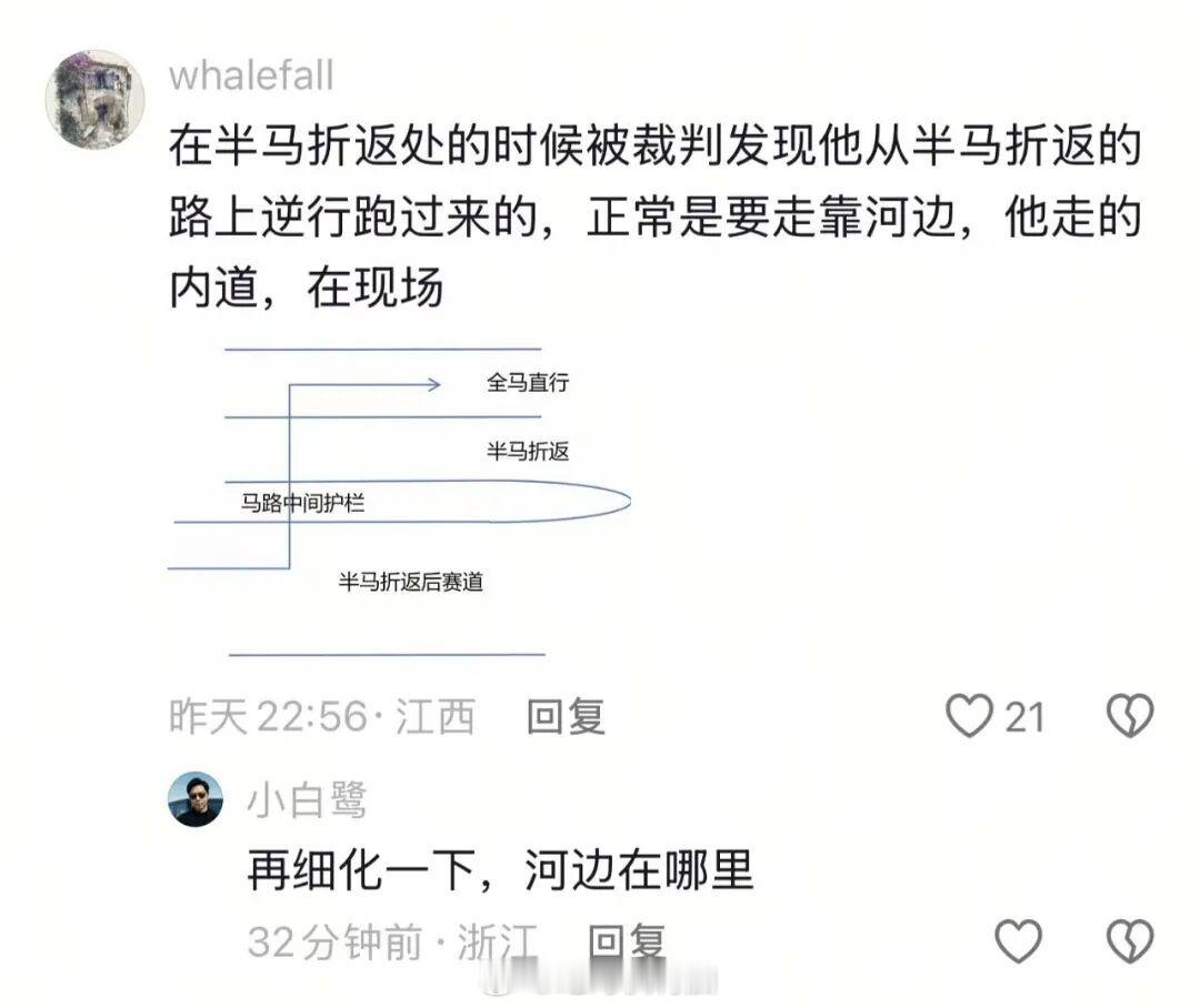 2025年12月7日赣州马拉松半程比赛中,领先的选手高圣杰在比赛尾声被裁判拦下,并被出示红牌取消比赛资格。由于当时并没有其他信息,只有一个“切内道”的说法让大家很疑惑。刚看到《马拉松研究院》的文章搞明白了。原来是全半马分道后,高圣杰选择了跨越赛道(即从全半马混合赛道南行→半马折返北行)去跑。也就是图1红框中,他本应跑橙线却跑了最左侧的蓝线。之前还讨论是否赛道上缺了隔离锥或者他跑上了边道之类,这么看地图,以中国赛事组织的惯例,不在现场也知道他的确是明知故犯了。好了,民间的谜解开了。还有个中国马拉松精英排名赛暨长荡湖马拉松距离不足的官方的谜待破解。赣州马拉松 赛事组织 长荡湖马拉松