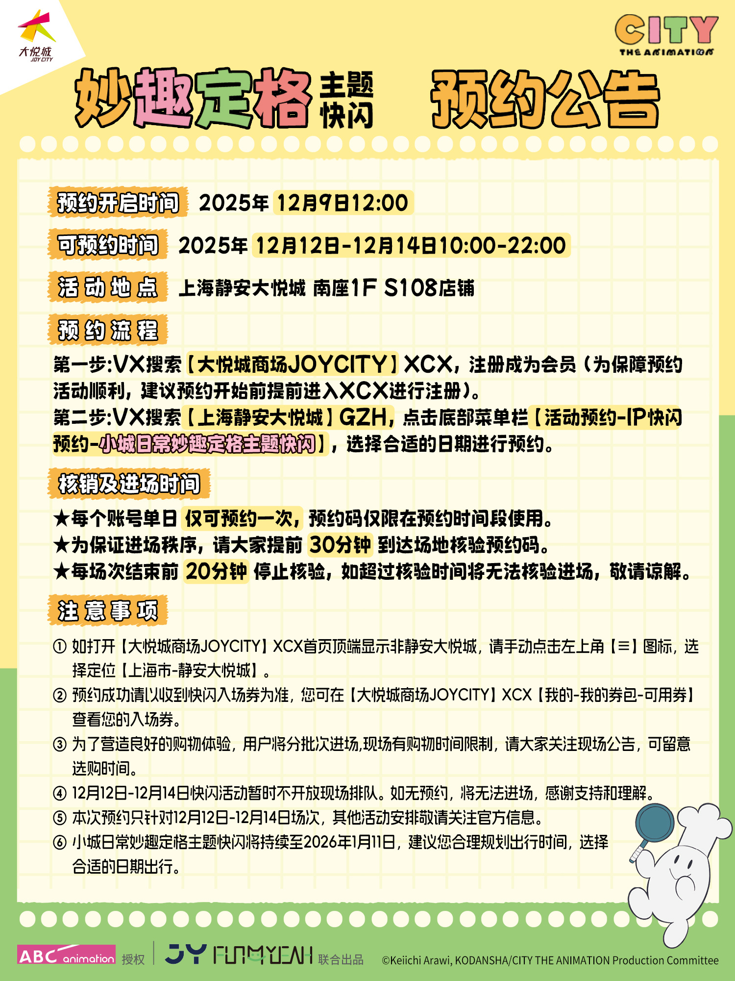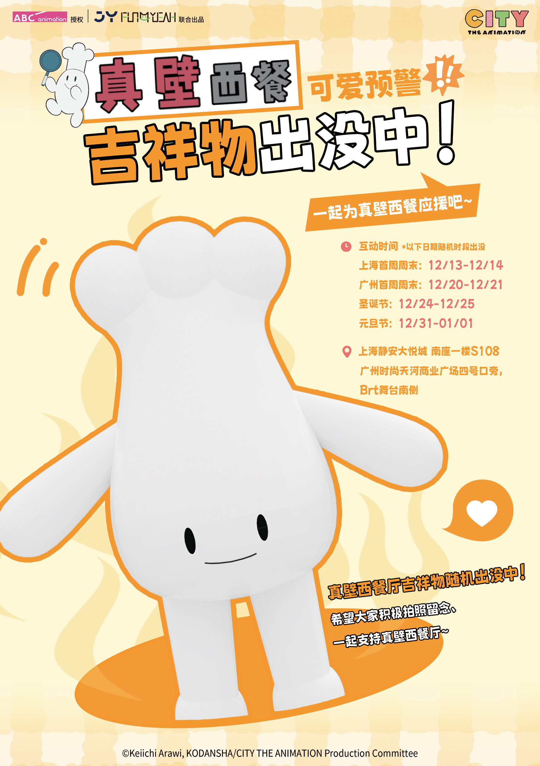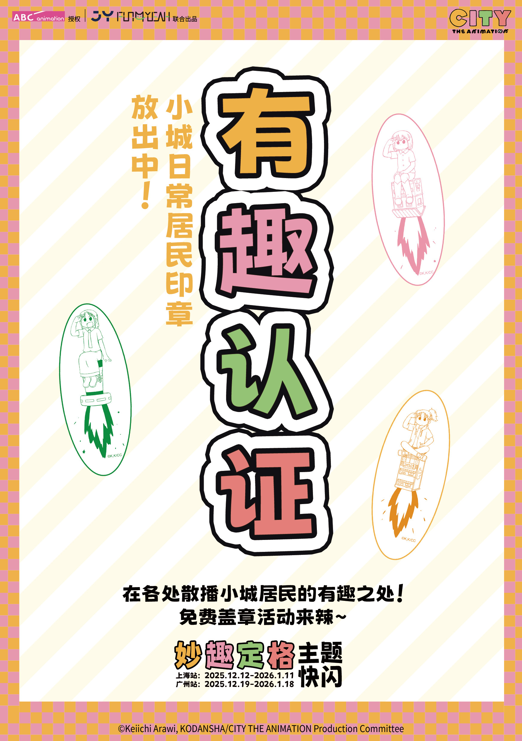 “你找到有趣的事了吗?”小城日常小城日常妙趣定格快闪京阿尼 京阿尼倾力制作、带来无数欢笑的7月番剧《小城日常》快闪即将开始!《小城日常》妙趣定格快闪将在【上海静安大悦城 南座一楼S108,12.12-1.11】和【广州时尚天河商业广场四号口旁,Brt舞台南侧,12.19-1.18】两地举办,一起感受那个夏天的欢笑与感动吧~这里有还原动画的幸运物大转盘、温暖贴贴的真壁吉祥物、小城居民百面相手举牌、还有免费盖章处和小镇居民评选墙,快来现场一探究竟~更多《小城日常》妙趣定格主题快闪,敬请关注