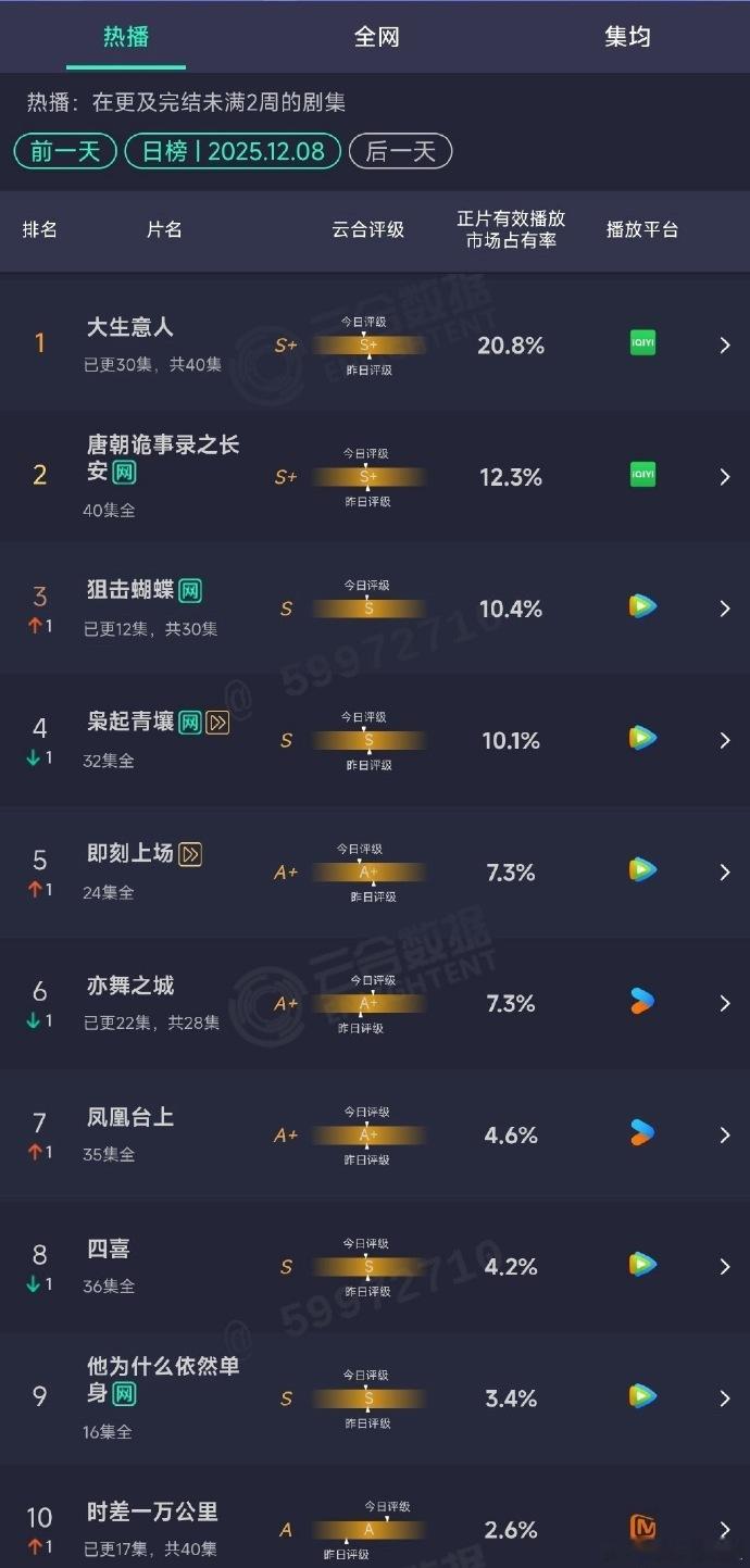 云合数据显示《大生意人》突破 20%,《狙击蝴蝶》达 10%,两部作品以独特叙事与精良制作,赢得市场积极反馈。双剧齐破数据强化内容品质的传播价值。大生意人云合破20%狙击蝴蝶云合破10%