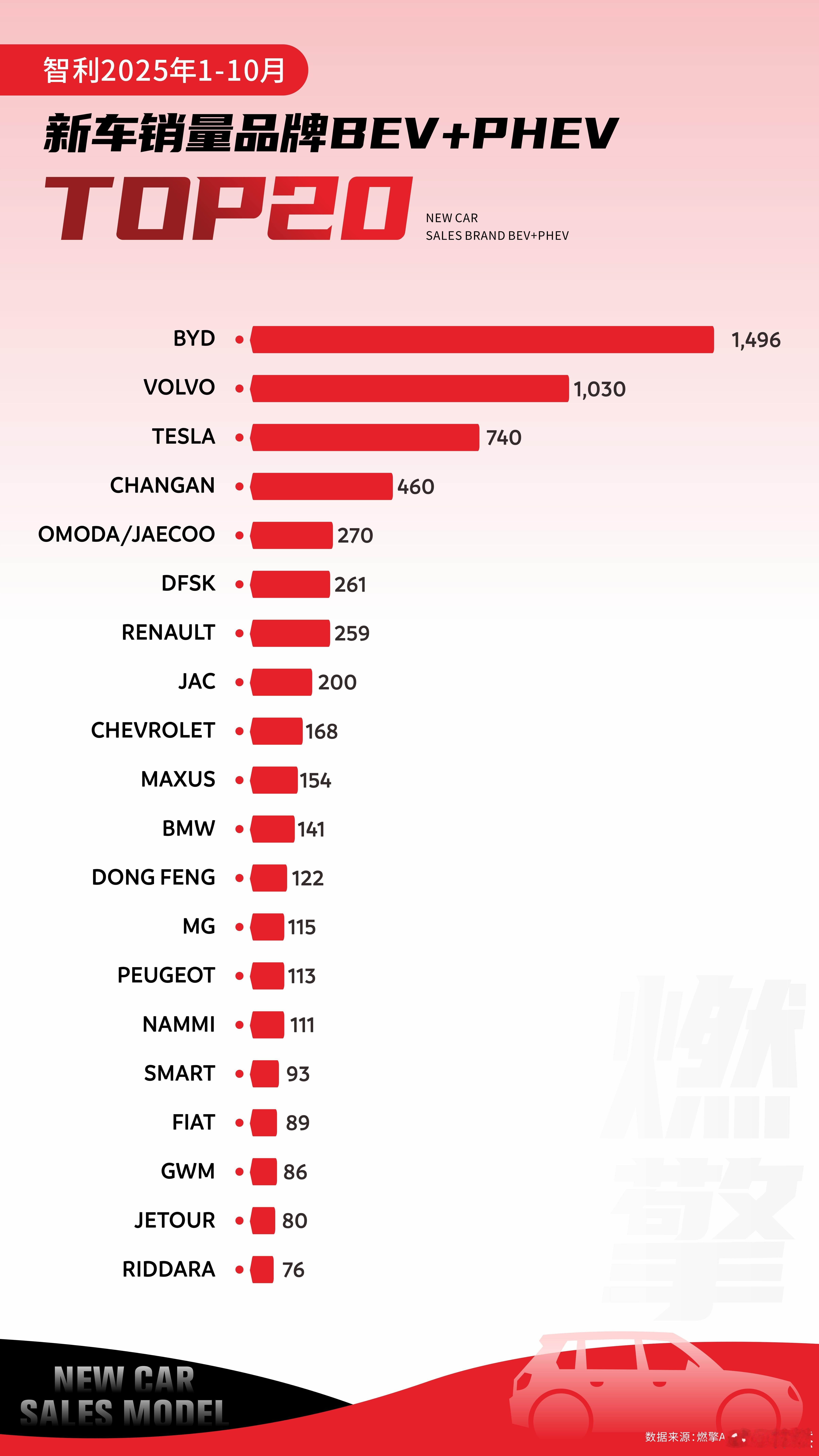 智利新能源车市,比亚迪遥遥领先1-10月,智利新能源市场展现出以中国品牌为主导的初期发展特征。比亚迪凭借显著优势占据榜首,多个中国品牌在细分市场积极布局,而传统及豪华品牌的电动化进程则相对缓慢,这与智利市场注重实用与性价比的起步阶段需求高度契合。比亚迪以1496辆的累计销量位居第一,达到第二名沃尔沃的1.4倍。其宋、元等系列新能源车型,在满足城市通勤需求的同时,部分SUV产品也兼顾了当地的山地路况。配合全面的配置与相较于欧美品牌更亲民的价格,精准把握了智利消费者务实、理性的购车偏好,确立了市场领先地位。除比亚迪外,长安、OMODA/JAECOO、DFSK等中国品牌也在各自领域取得进展,形成了差异化布局。长安以460辆的销量聚焦经济型纯电市场,服务预算有限的用户;OMODA/JAECOO以270辆的销量,凭借年轻化设计吸引家庭消费者;DFSK与JAC则分别以261辆和200辆的销量,专注于商用新能源车型,满足小型商业运输的刚性需求。这种多品牌、多场景的协同策略,使中国品牌在智利新兴新能源市场占据了重要地位。相比之下,传统与豪华品牌的市场表现相对有限。沃尔沃凭借安全口碑与新能源车型以1030辆的销量位居第二,但仍与头部存在差距;特斯拉以740辆的销量,其品牌溢价在注重实用性的智利市场优势不明显;雷诺、雪佛兰等传统品牌的新能源车型销量则处于较低水平。整体而言,传统阵营的电动化转型节奏与产品策略,尚未充分适应当地市场的核心需求。大v聊车