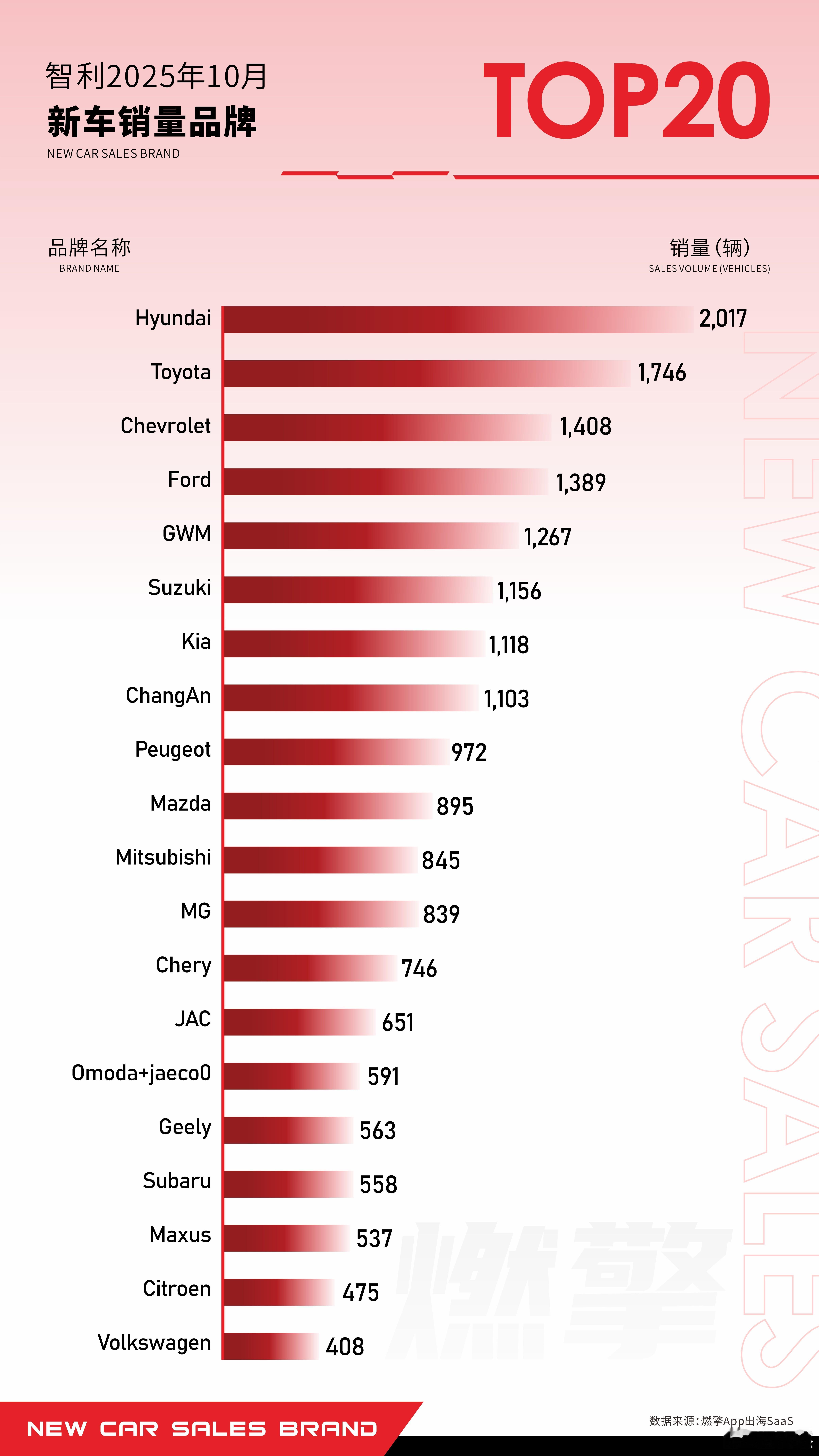 智利车市,长城领跑10月,智利新车市场呈现出多元化的竞争态势。现代与丰田凭借全场景车型组合保持领先,美系品牌专注于满足商用刚需,而多个中国品牌则通过高性价比策略在中端市场实现了集体突破,精准契合了当地消费者重视实用性与适应性的购车需求。现代与丰田分别以2017辆和1746辆的月销量位居市场前列。现代旗下SUV车型凭借良好的通过性适应智利复杂的山地路况,丰田则通过皮卡与家用车产品线兼顾商用运输与家庭出行。两家品牌依靠长期建立的产品可靠性口碑,共同占据了市场的主导地位。美系品牌方面,雪佛兰与福特分别以1408辆和1389辆的销量,主要依靠Silverado和F系列等皮卡车型满足农场作业及货物运输等核心商业需求。同时,其家用SUV产品也在城市通勤市场占有一席之地,成为智利市场传统的实用选择。中国品牌在本月表现突出,共有六个品牌进入销量前二十,形成明显的市场冲击力。长城汽车以1267辆的销量位居第五,其哈弗SUV及坦克系列越野车凭借出色的地形适应性成为中国品牌的领军者。长安汽车以1103辆的销量主打经济型家用车市场。MG、奇瑞、JAC和Maxus等品牌则凭借高配置与亲民价格的组合,成功覆盖了入门级家用及商用细分市场。中国品牌的集体上榜,表明其产品策略已精准匹配智利市场“实用且实惠”的主流消费偏好。其他品牌如铃木、起亚和标致等,主要在小型经济车、韩系性价比车型及中端家用车等特定细分市场维持份额,市场增长势头相对平缓。未来,现代与丰田的领先地位在短期内预计将保持稳定,但中国品牌展现出显著的增长潜力。若长城能进一步强化越野车型的本地化适配,其他中国品牌能完善售后服务网络,其市场份额有望持续提升。美系品牌的皮卡车型因其不可替代的实用价值,需求将保持稳定,但其家用车市场份额可能面临中国品牌的分流压力。大v聊车