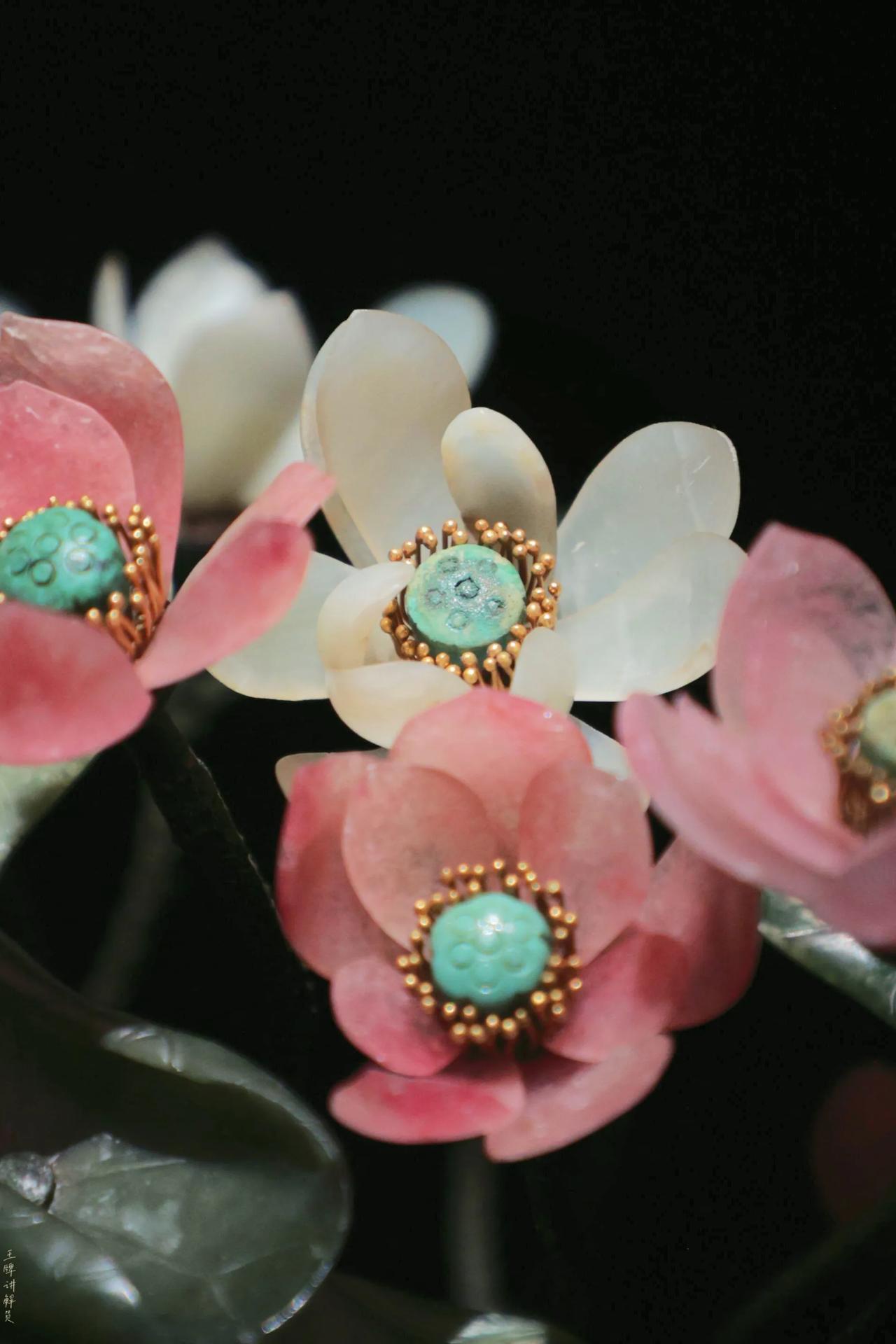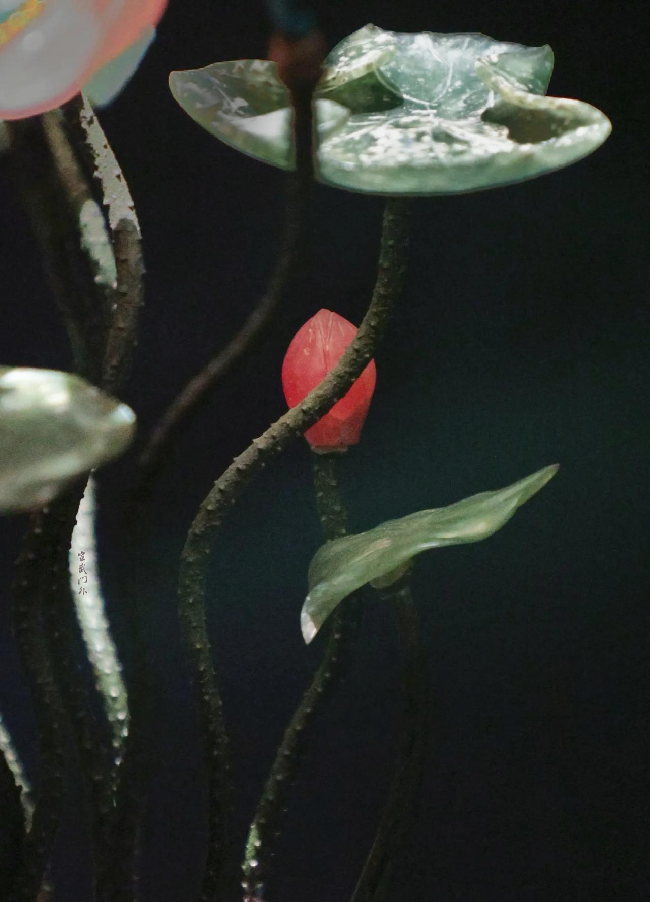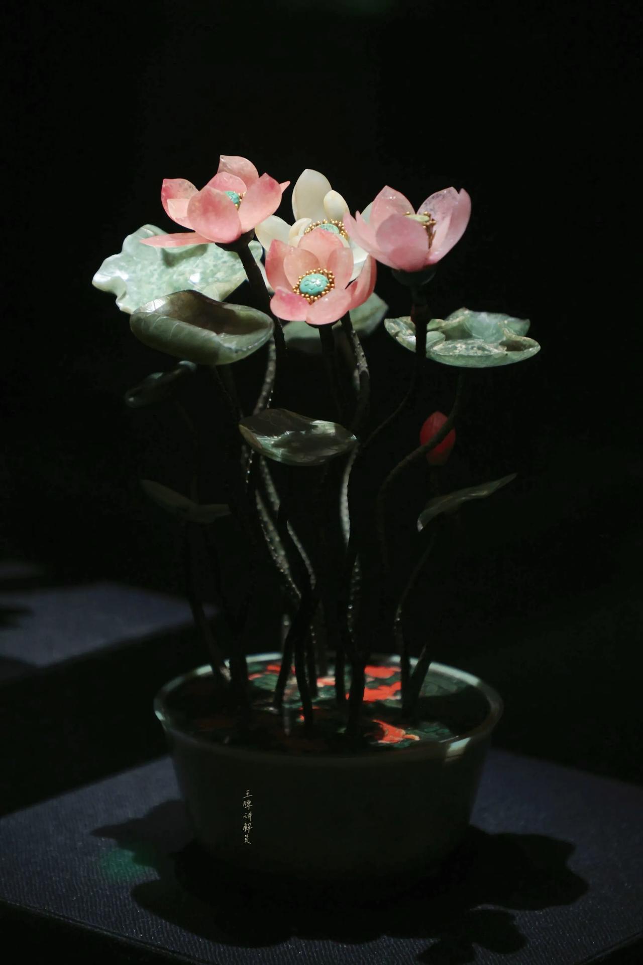 【妙在不俗】 玉石盆景是一类名贵文物,看名称就知道,以玉石为原材料,自然价值连城。但恰恰因为原料昂贵,导致成品常常大红大绿,金碧辉煌,就很容易沾俗气。 这件荷花盆景恰恰妙在不俗,只在花蕊使用黄金,整体以青玉白玉为主,衬托三朵粉色荷花,素雅中搭配一抹红,格调就高起来了。 故宫是全球收藏玉石盆景最多的单位,拥有多达1400盆,许多对外开放的宫殿都会放上一两盆。 但这件荷花盆景平时不展出,最近陈列在斋宫“玉出昆冈——清代宫廷和田玉文化特展”,闭展日是2026年1月4日。王牌讲解员的一物一说 故宫