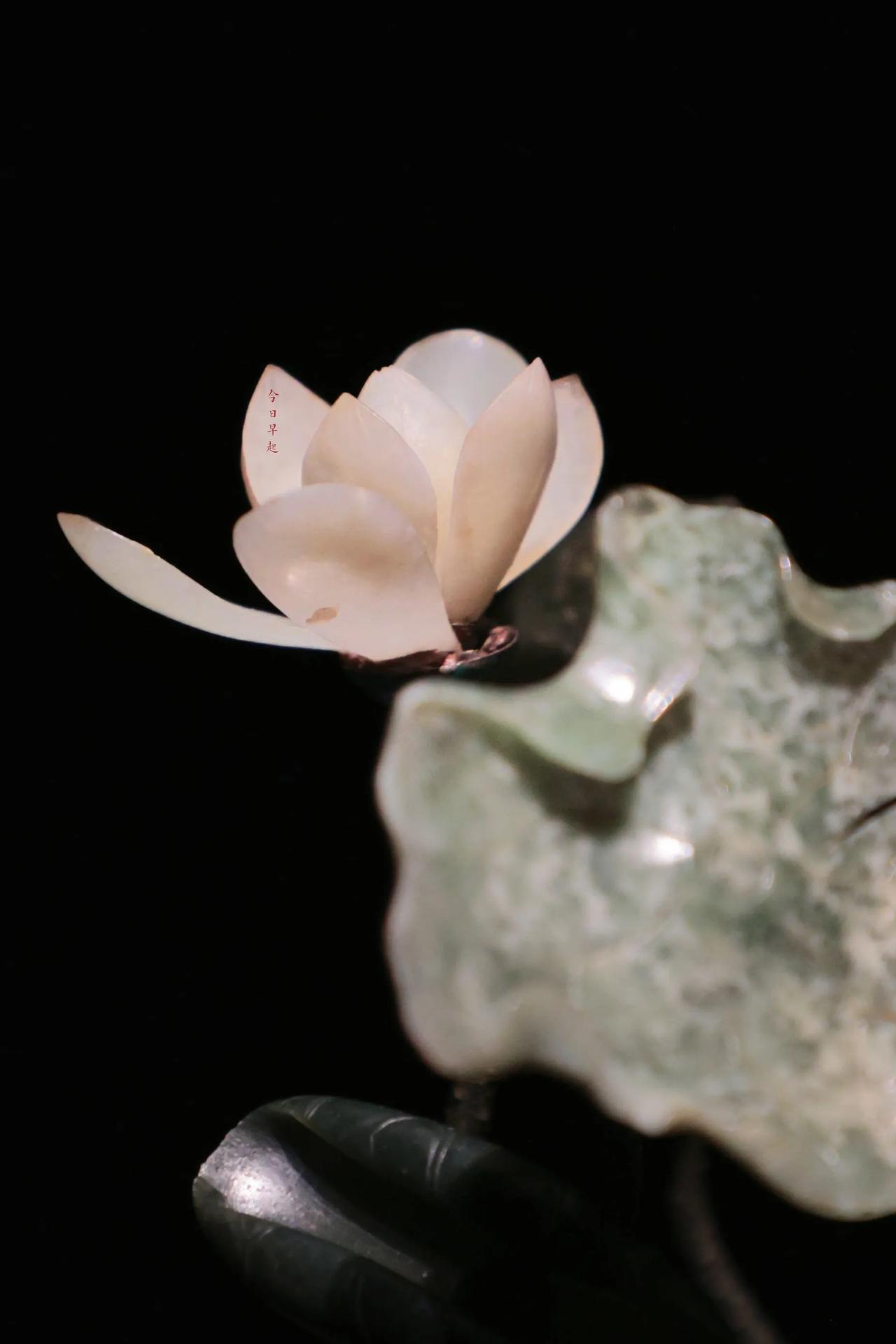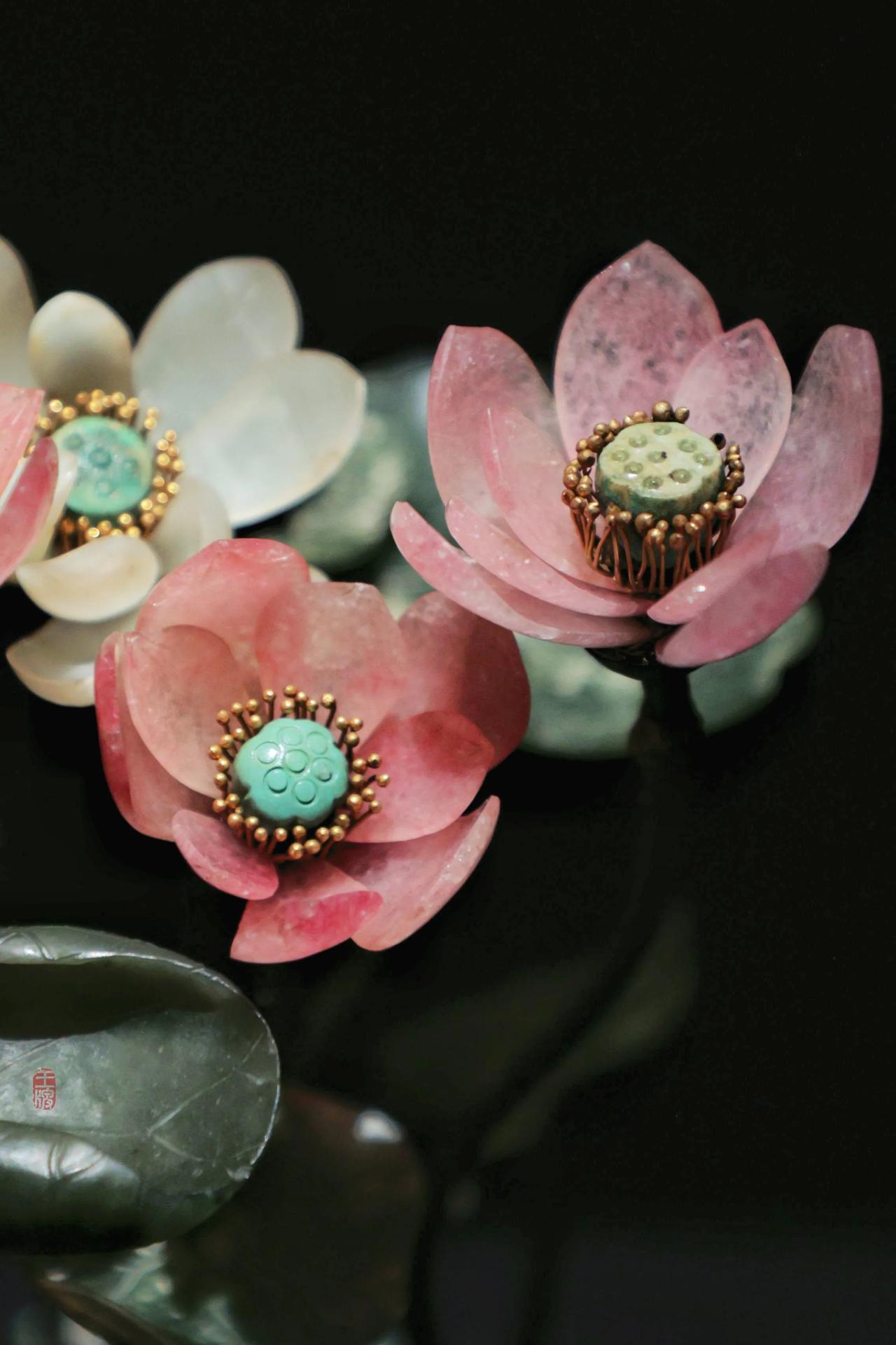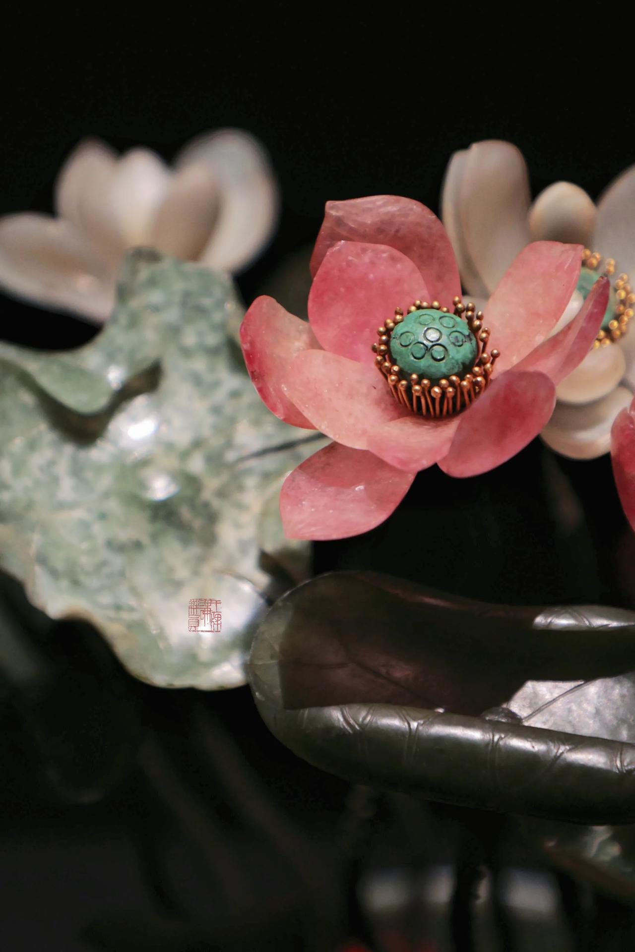 【妙在不俗】 玉石盆景是一类名贵文物,看名称就知道,以玉石为原材料,自然价值连城。但恰恰因为原料昂贵,导致成品常常大红大绿,金碧辉煌,就很容易沾俗气。 这件荷花盆景恰恰妙在不俗,只在花蕊使用黄金,整体以青玉白玉为主,衬托三朵粉色荷花,素雅中搭配一抹红,格调就高起来了。 故宫是全球收藏玉石盆景最多的单位,拥有多达1400盆,许多对外开放的宫殿都会放上一两盆。 但这件荷花盆景平时不展出,最近陈列在斋宫“玉出昆冈——清代宫廷和田玉文化特展”,闭展日是2026年1月4日。王牌讲解员的一物一说 故宫