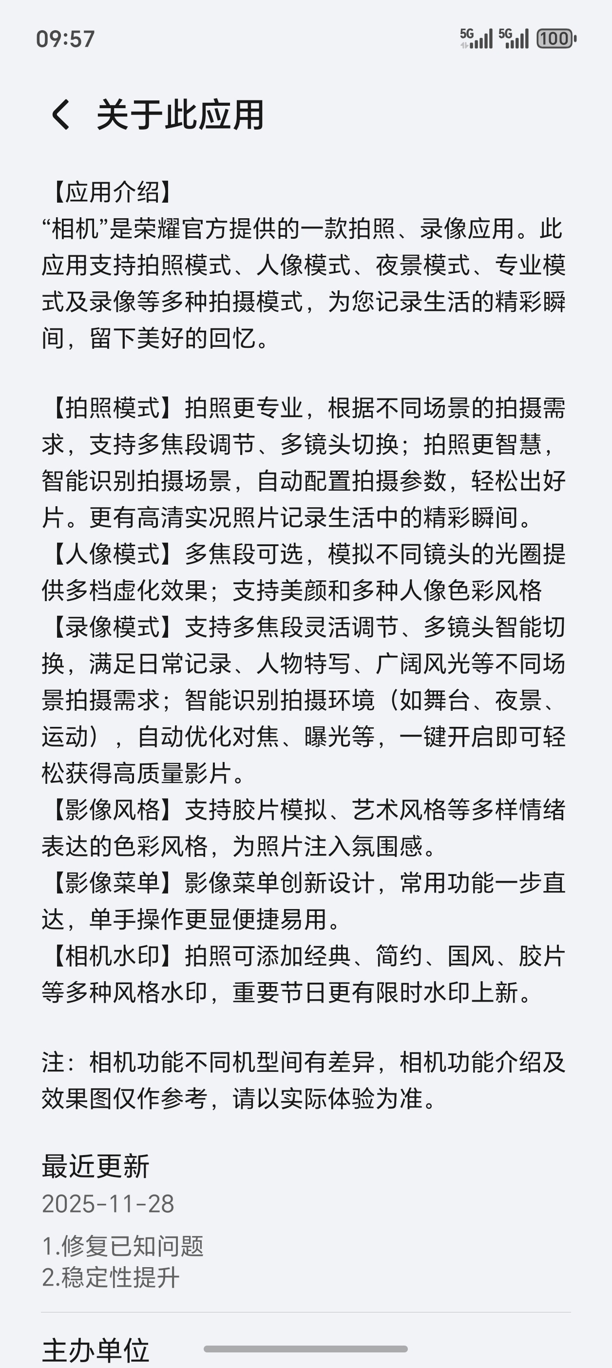 荣耀相机应用解耦已上线应用市场相机上线后,Magic8系列相机迎来了第一个应用市场内更新。版本号170.10.0.201,内容为修复已知问题,稳定性提升