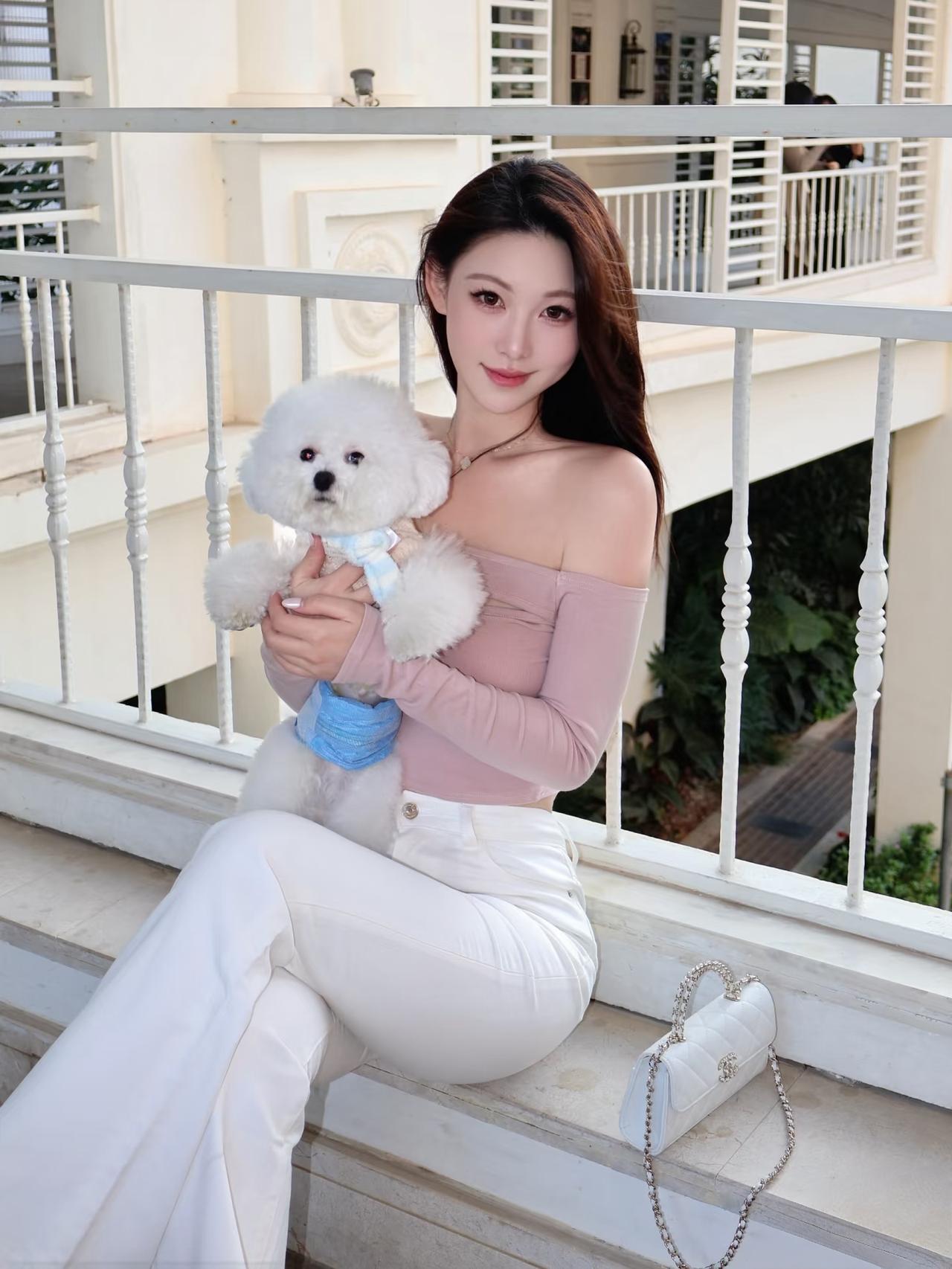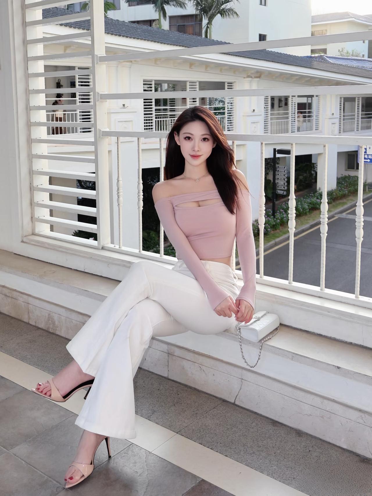 高挑优雅气质的白裙与粉色上衣的完美搭配,坐在阳台上,尽显温柔与时尚。