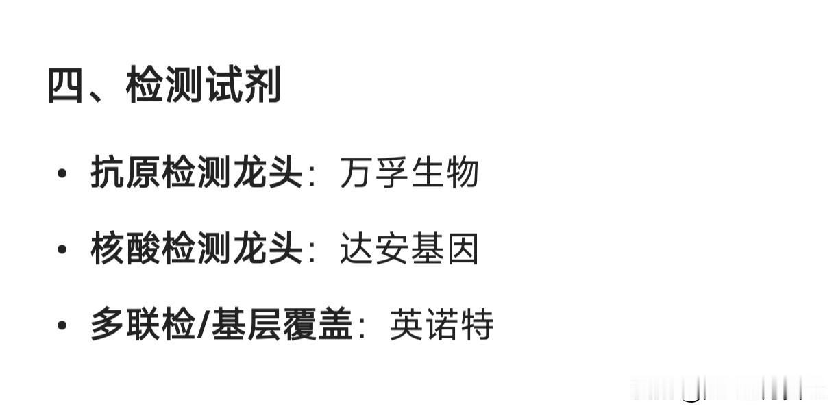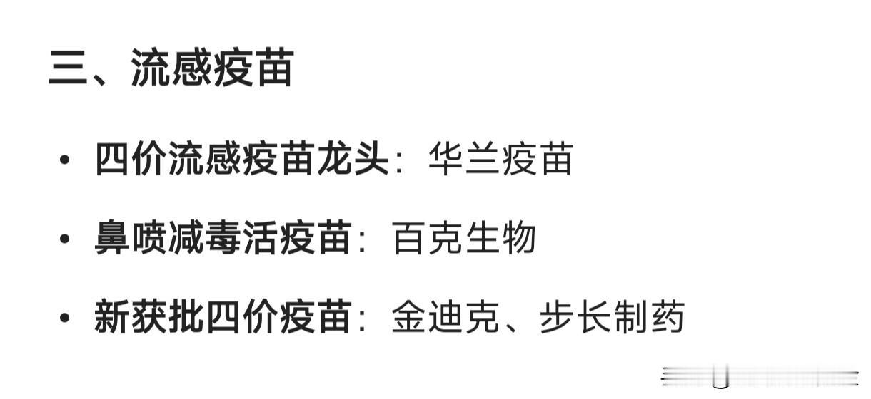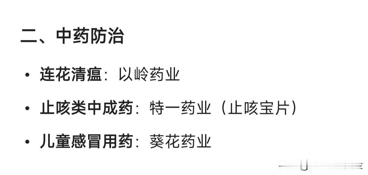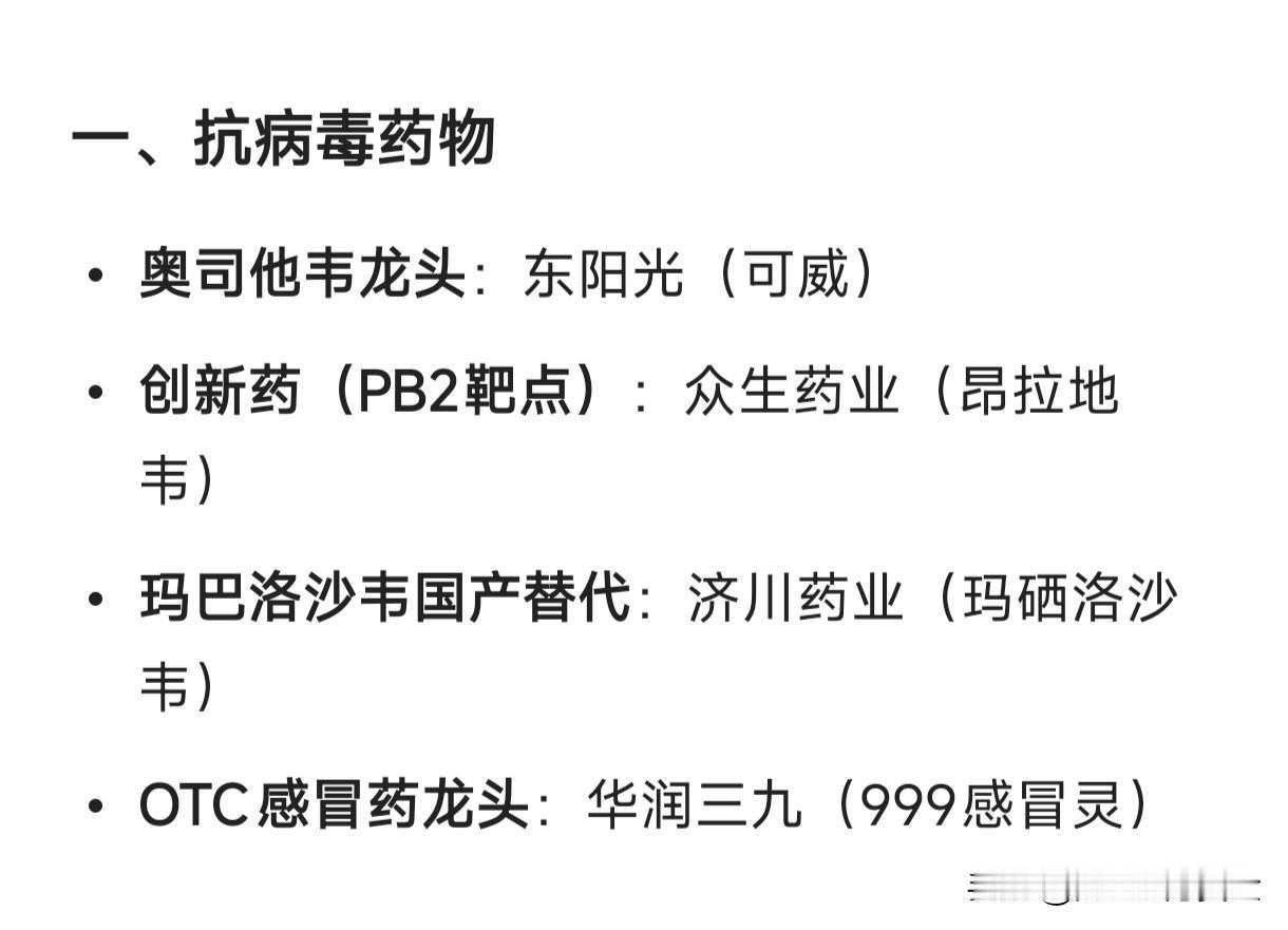 流感概念的细分龙头企业汇总: 一、抗病毒药物 奥司他韦龙头:东阳光(可威) 创新药(PB2靶点):众生药业(昂拉地韦) 玛巴洛沙韦国产替代:济川药业(玛硒洛沙韦) OTC感冒药龙头:华润三九(999感冒灵) 二、中药防治 连花清瘟:以岭药业 止咳类中成药:特一药业(止咳宝片) 儿童感冒用药:葵花药业 三、流感疫苗 四价流感疫苗龙头:华兰疫苗 鼻喷减毒活疫苗:百克生物 新获批四价疫苗:金迪克、步长制药 四、检测试剂 抗原检测龙头:万孚生物 核酸检测龙头:达安基因 多联检/基层覆盖:英诺特 五、医药零售终端 连锁药店代表:老百姓、益丰药房、漱玉平民 流通+终端放量:海王生物