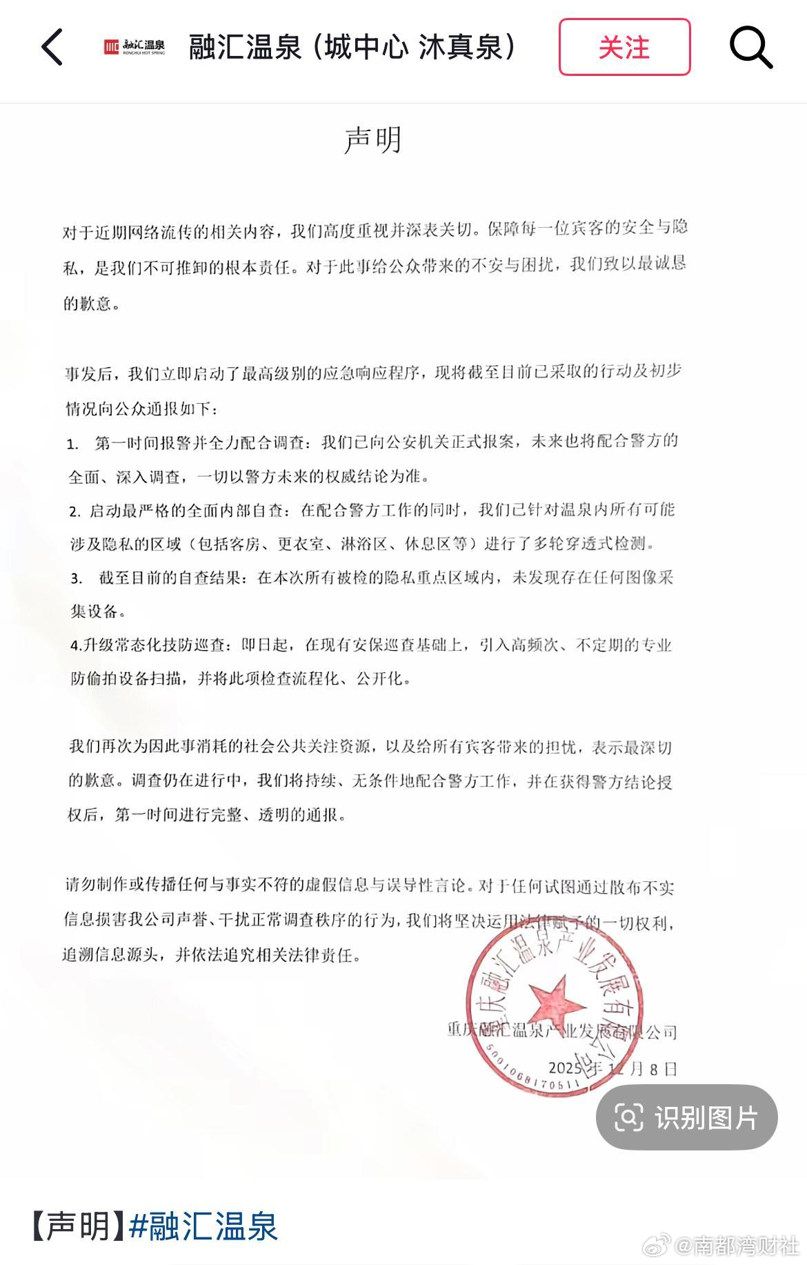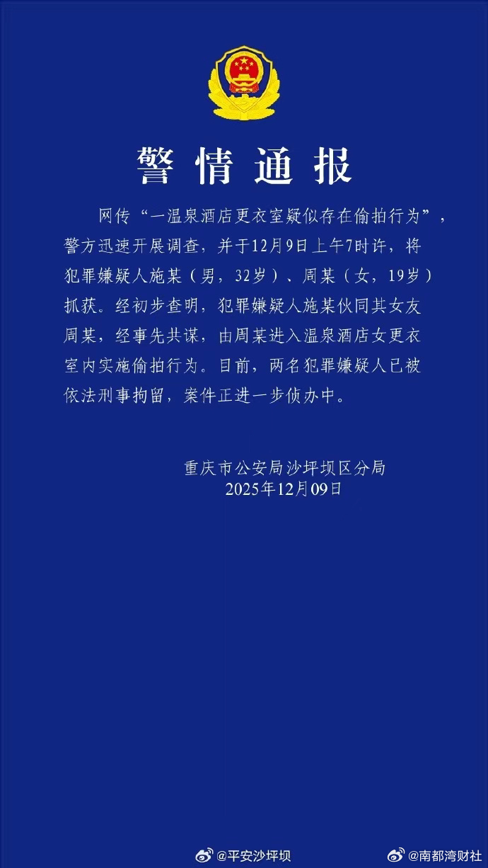 #警方通报重庆一温泉更衣室偷拍事件##2人温泉更衣室偷拍被刑拘##重庆融汇温泉回应更衣室被偷拍# 【重庆融汇温泉更衣室有偷拍!警方通报称两人被刑拘,公司回应】近日,有网友在社交平台连续发布多条帖子称,有大量客人被偷拍。该网友发布的画面显示,在疑似更衣室内,有部分顾客在更衣,有物品印有“融汇”字样。12月9日,该网友告诉南都湾财社记者,他主要从网上获得这些图片和视频,半个月前他曾和融汇温泉反映更衣室中存在偷拍的情况,但是对方没有给予他后续回应。重庆融汇温泉官方公众号显示,其主体企业为重庆融汇温泉产业发展有限公司。天眼查显示,该公司成立于2007年,注册资本为11000万元,融汇国际投资控股有限公司间接持有该公司99%的股份。针对此事,南都湾财社记者致电该公司,电话未能接通。12月8日下午,融汇温泉官方账号发布声明表示,已第一时间报警并全力配合调查;在配合警方工作的同时,已针对温泉内所有可能涉及隐私的区域进行多轮穿透式检测,包括客房、更衣室、淋浴区、休息区等;在本次所有被检的隐私重点区域内,未发现存在任何图像采集设备。融汇温泉表示,即日起,在现有安保巡查基础上,引入高频次、不定期的专业防偷拍设备扫描,并将此项检查流程化、公开化。12月9日,重庆市公安局沙坪坝区分局在官方微博发布警情通报表示,网传“一温泉酒店更衣室疑似存在偷拍行为”事件中,经初步查明,犯罪嫌疑人施某(男,32岁)伙同其女友周某(女,19岁),经事先共谋,由周某进入女更衣室实施偷拍行为。两名犯罪嫌疑人已于12月9日上午7时许被抓获,并被依法刑事拘留。案件正进一步侦办中。采写:实习生 林子蓁 南都湾财社记者 冯家钜