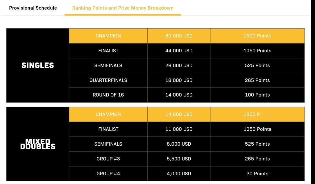 香港总决赛奖金是多少? 总盘子130W美金,年终的大礼包。 单打,参赛就有14000美金打底,冠军可以拿80000,亚军44000。 四强、八强、十六强都各有封赏, 现在知道为什么要攒积分了吧? 积分就是一张通行证,拿大礼包的敲门砖。 混双相对而言寒酸了些,冠军只拿到相当于单打16强的奖金。 进入4强8000打底。 小组赛垫底可以拿走4000。 机票钱应该够了。