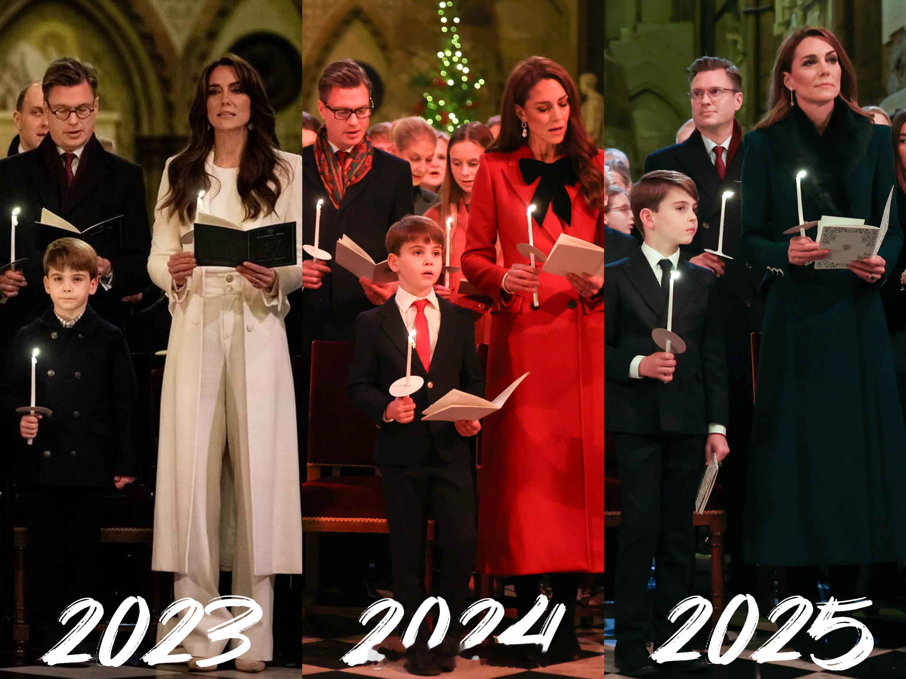 路易王子 2023➡️2025【论家里有巨人族】自从2023年以来,格洛斯特公爵夫妇的女婿George Gilman每年都会参加圣诞颂歌音乐会,由图可见,可以看得出来威尔士路易王子今年身高快逼近George Gilman的肩膀,George Gilman每年都换不一样的眼镜参加。