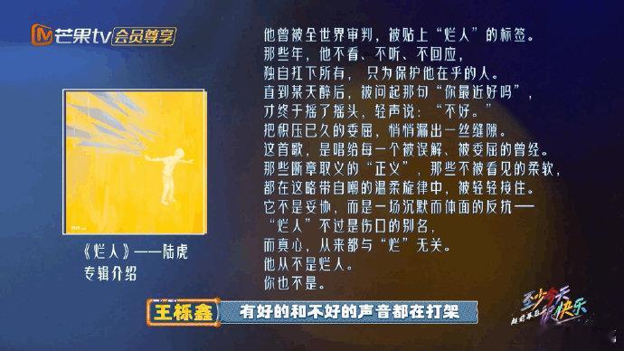 陆虎 烂人带给误会王栎鑫的人 至少今天很快乐演唱会超前幕后,陆虎和王栎鑫的互动全是真情实感。面对《烂人》之前引发的各种评价,王栎鑫不想回避只想直面解决