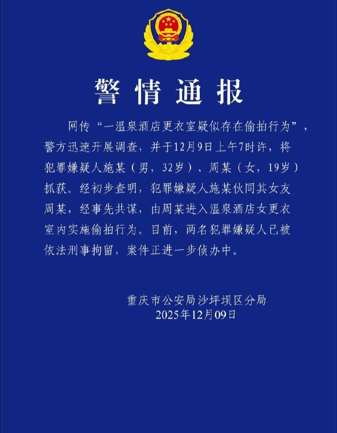 这下终于知道网上小视频怎么偷拍的吧![捂脸] 重庆警方:施某(男,32 岁)伙同女友周某(女,19 岁),事先共谋,由周某进入温泉酒店女更衣室内偷拍,两人被刑拘! 所以说男的怎么敢偷拍女人,肯定是夫妻共同犯案,而且还是男人指挥,女人去干活,赚到钱后再46分。[呲牙] 我猜男的一般偷拍肯定不是真人,都是把摄像头藏起来,淋浴头,镜子里,防火罩里,额只能想起这么几个,看来我平时小视频看的太少了,有看的多的老铁给科普一下,惊醒逝人,拯救万千女性,造福社会!