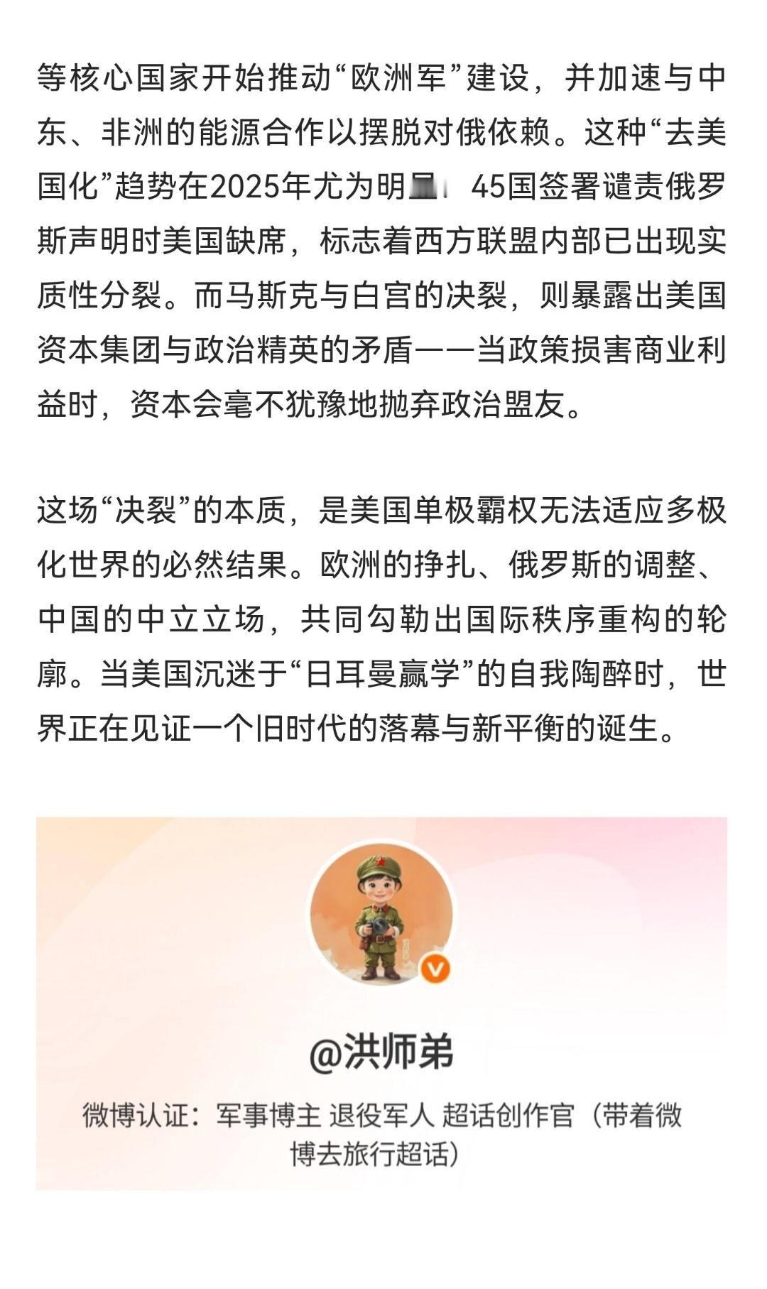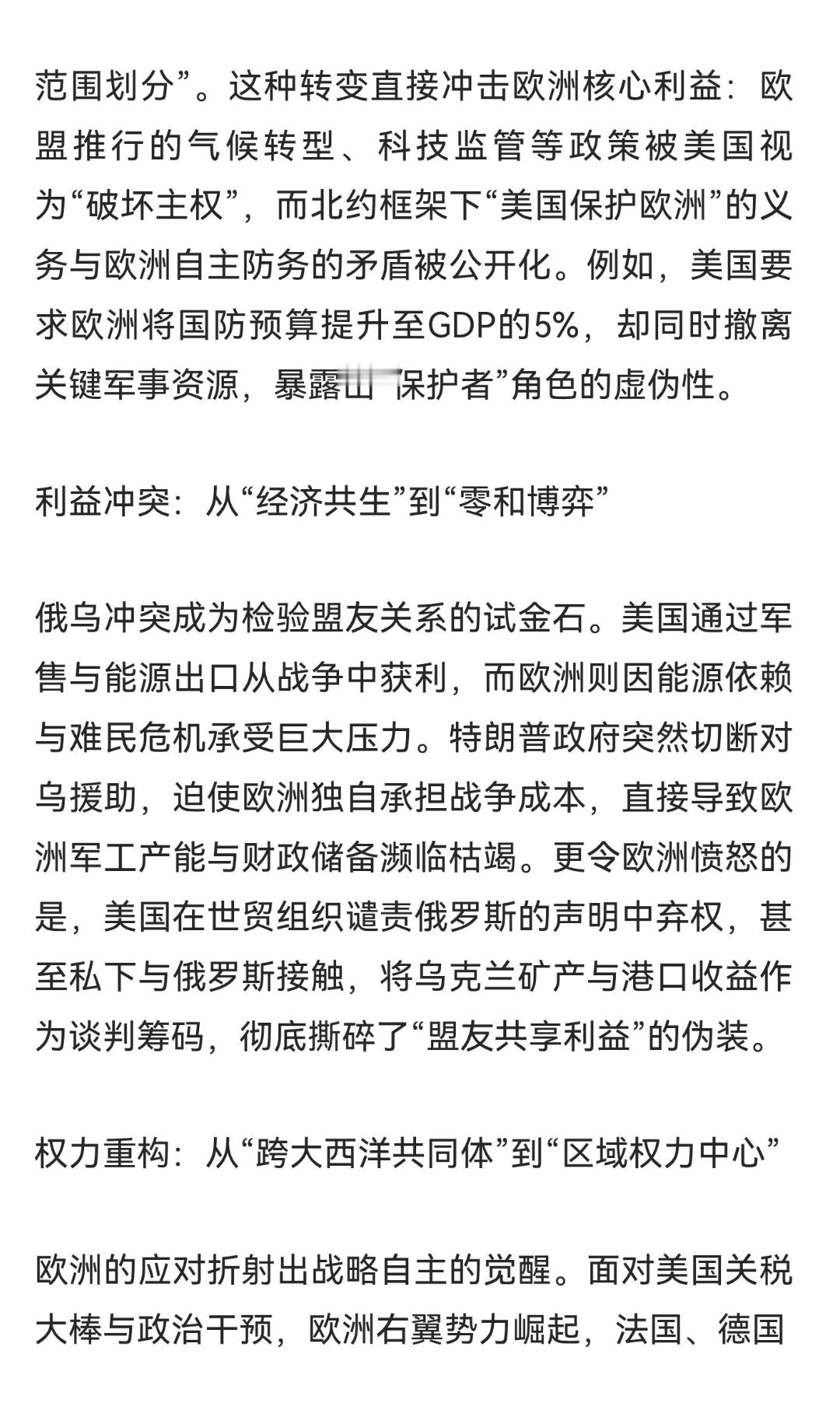 | 2025年12月,英国《金融时报》披露的《白宫与西方联盟决裂》社论,将美国与欧洲盟友的裂痕推至台前。这场“决裂”并非突然断裂,而是长期积累的结构性矛盾在特朗普政府政策激化下的集中爆发,其本质是美国单极霸权衰落与多极化趋势加速的碰撞。特朗普政府将捍卫民主、自由贸易等传统价值观视为“削弱实力的累赘”,转而强调“国家主权优先”与“利益范围划分”。这种转变直接冲击欧洲核心利益:欧盟推行的气候转型、科技监管等政策被美国视为“破坏主权”,而北约框架下“美国保护欧洲”的义务与欧洲自主防务的矛盾被公开化。例如,美国要求欧洲将国防预算提升至GDP的5%,却同时撤离关键军事资源,暴露出“保护者”角色的虚伪性。俄乌冲突成为检验盟友关系的试金石。美国通过军售与能源出口从战争中获利,而欧洲则因能源依赖与难民危机承受巨大压力。特朗普政府突然切断对乌援助,迫使欧洲独自承担战争成本,直接导致欧洲军工产能与财政储备濒临枯竭。更令欧洲愤怒的是,美国在世贸组织谴责俄罗斯的声明中弃权,甚至私下与俄罗斯接触,将乌克兰矿产与港口收益作为谈判筹码,彻底撕碎了“盟友共享利益”的伪装。面对美国关税大棒与政治干预,欧洲右翼势力崛起,法国、德国等核心国家开始推动“欧洲军”建设,并加速与中东、非洲的能源合作以摆脱对俄依赖。这种“去美国化”趋势在2025年尤为明显:45国签署谴责俄罗斯声明时美国缺席,标志着西方联盟内部已出现实质性分裂。而马斯克与白宫的决裂,则暴露出美国资本集团与政治精英的矛盾——当政策损害商业利益时,资本会毫不犹豫地抛弃政治盟友。这场“决裂”的本质,是美国单极霸权无法适应多极化世界的必然结果。欧洲的挣扎、俄罗斯的调整、中国的中立立场,共同勾勒出国际秩序重构的轮廓。当美国沉迷于“日耳曼赢学”的自我陶醉时,世界正在见证一个旧时代的落幕与新平衡的诞生。