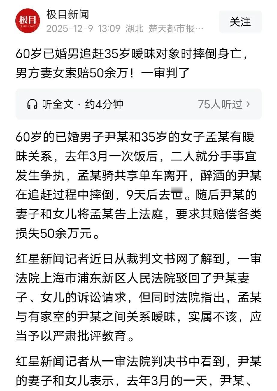 上海, 60岁大叔和35岁的三妹出去吃饭唱歌,回家途中,两人就分手事宜发生争吵,三妹一气之下骑着共享单车离去,大叔急了,跟在后面边喊边追,不料,一个不留神摔了个跟头当场昏迷不醒,被路人送医后,大叔在医院抢救了9天后离世。家属悲痛欲绝,把三妹告上法庭,索赔50万,她们认为,大叔醉酒后三妹没把他安全送到家,还狠心骑车离去,让60岁的老人在后面追,是她害死了大叔。法院最终这么判。 尹先生原本有一个幸福美满的家庭,妻子贤惠顾家,女儿也乖巧懂事,但尹某人老心不老,60岁的他在一次偶然的机会,认识了35岁的孟某。 孟某年轻、有活力,也懂得哄人开心,尹某很快就沦陷了。 认识不久,尹某就背着妻女偷偷和孟某搞到一起,两人有事没事经常出去约会,就像年轻的小情侣谈起了恋爱。 2024年3月份的一天,尹某、孟某和他们的朋友出去吃饭喝酒,吃饱喝足后有人提议去KTV唱歌。 尹某和孟某都没喝多少酒,既然朋友们邀请了,他们也没有拒绝,跟着大伙开开心心去了KTV。 不过,歌唱到一半,两人中途就一起离开了,从KTV出来后,尹某叫了一辆出租车。 坐到车上后,两人之间的关系发生了微妙的变化,孟某那段期间想跟尹某分手了,她不想不明不白这么处下去,但是尹某舍不得分。 出租车离开KTV后不久,尹某为了哄孟某,提出半路下车,两人一起散散步,孟某没有拒绝,两人一起下了车。 谁料,他们走了没多远就发生了激烈的争吵,孟某伤心了,一气之下在路边扫了一辆共享单车后骑上车狠心离去。 尹某看着心爱的女人就这样扔下自己,很着急,也很心痛,情急之下他跟在孟某后面追,边追边喊,想要孟某停下来。 可孟某不知道是没听见,还是故意不理尹某,她的车子飞速往前开,尹某看着孟某越来越远,心里着急不已。 不料,一个不留神他摔了一跤,尹某的头重重摔到地上,当场就爬不起来了。 有路人看到尹某摔跤后,试图叫醒他,但是尹某毫无反应,最终路人拨打了急救电话。 孟某不懂是不知道尹某摔跤呢,还是不想理,就这样骑车头也不回地离去了。 尹某被送到医院后,院方通过他的手机,通知了家属,家属赶到后,看着昏迷不醒的尹某着急不已,他们请求医生全力抢救。 但是,尹某在医院抢救了9天后,最终还是离开了人世。 孟某知道这个消息震惊不已,她在感叹生命脆弱的同时,也感到一丝丝不安。 尹某妻女在处理完他的后事后,认为尹某的死跟孟某脱不了干系。 她们认为尹某是60岁的老人,孟某作为跟他一起出去喝酒的人,非但没有把他安全送回家,还骑车离去让尹某在后面追,她对尹某的死亡应该负责。 尹某妻女把孟某告上法庭,向她索赔50万元。 法庭上,孟某辩称,她不是聚餐组织者,也没有劝酒行为,而且尹某当晚并没有喝多少酒,上出租车的时候,他还跟司机正常交流,更重要的是,她骑车离开时手机开着导航并没有听到尹某的喊声,也不知道他在后面追。 法院去医院调了尹某的病历,看到事发当晚10点就下了病危通知,说可能是心源性猝死,抢救后9天尹某还是死了,死因是心脏呼吸衰竭,跟喝酒没关系。 一审法院认为,要告别人侵权赔钱,得拿出证据证明对方有违法、故意/过失的行为,而且对方的行为和尹某死亡有直接关系,但原告拿不出这些证据。 原告说被告没护送醉酒的尹某,可尹某不是因为喝酒死亡的,加上尹某是成年人,得自己对自己负责,所以法院不支持原告要赔偿的诉求。 不过法院也批评了被告孟某,她和有家室的尹某搞暧昧,这事做得特别不对。 那么,从法律角度,如何看待这件事呢? 《民法典》第1165条规定,行为人因过错侵害他人民事权益造成损害的,应当承担侵权责任。 本案中,孟某骑车离去的行为本身不具有违法性,其无劝酒行为,也无法预见尹某会追逐并摔倒,主观上无故意或过失。 尹某的死亡原因是心脏呼吸衰竭,与孟某的离去行为无直接因果关系,且原告未能举证证明孟某存在侵权责任构成要件中的违法行为、主观过错及因果关系,所以,法院不支持赔偿诉求。 另外,《民法典》第1176条规定,自愿参加具有一定风险的文体活动,因其他参加者的行为受到损害的,受害人不得请求其他参加者承担侵权责任,但其他参加者有故意或重大过失的除外。 尹某作为完全民事行为能力人,明知自身60岁的年龄状况,仍自愿追逐骑行的孟某,其行为存在自身可预见的风险。 而且孟某对损害发生无故意或重大过失,尹某应自行承担自身行为的后果,该法条进一步印证了法院驳回原告诉求的合法性。 最后,我想说,这事儿里尹某的离世确实可惜,但法律判得没毛病。 孟某虽有道德瑕疵,可真没法律上的过错,既没劝酒也没放任危险,尹某作为成年人,得为自己冲动追逐的行为负责。 家属的悲痛能理解,但索赔于法无据,道德谴责不能替代法律判定。 关注@猫眼学法 品读案例故事,学习法律经验冬日生活打卡季