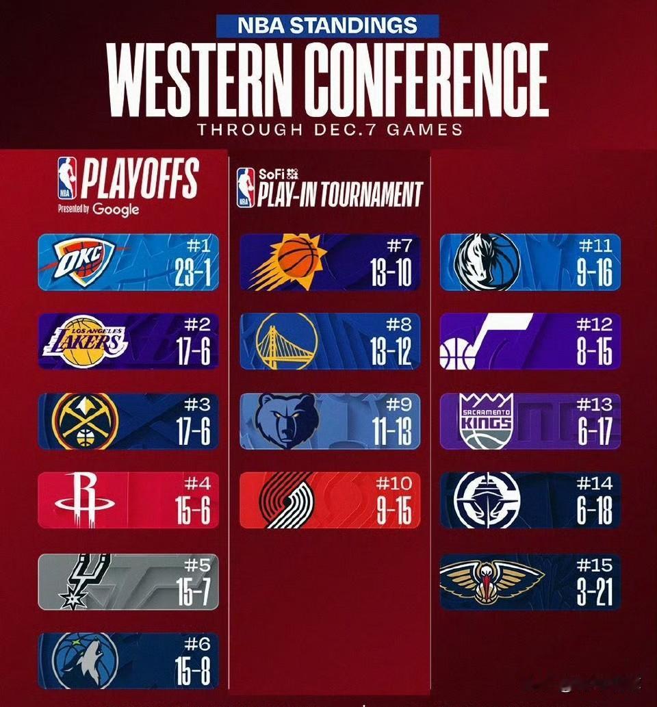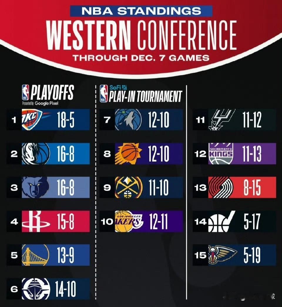 物是人非!同期西部战绩对比,快船队、独行侠队、灰熊队差距太大了! 图一为截止目前本赛季西部战绩排名,图二为上赛季同期西部战绩排名,可以发现变化还是非常巨大。雷霆队依旧是西部榜首,且战绩比上赛季还要好;湖人队、掘金队从上赛季的附加赛球队一跃成为第二、第三位;火箭队依旧是第四位,战绩非常稳定;马刺队由上赛季的第十一位升至第五位,进步明显;森林狼队、阵容大变的太阳队两队战绩变化不大。对比最明显的当属灰熊队、快船队、独行侠队,灰熊队上赛季排名西部第三位,本赛季跌至第九位;快船队上赛季排名第六位了本赛季排名第十四位;独行侠队上赛季排名第二位,本赛季排名第十一位,这让人完全意想不到了。