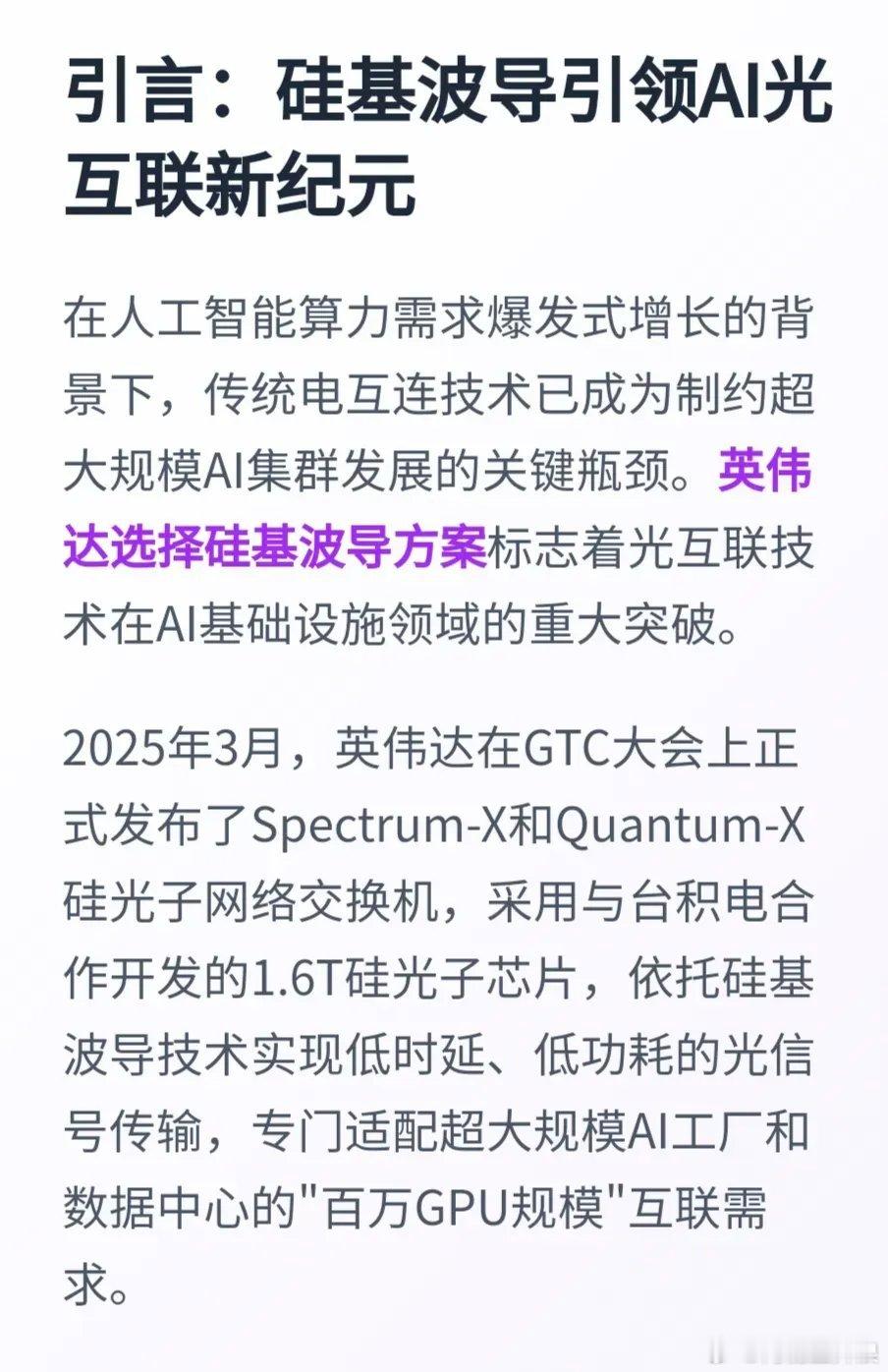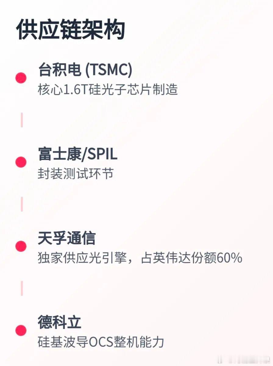 市场传出英伟达OCS(光电路交换)选择硅基波导方案后,德科立今天直接20厘米响应。德科立的核心竞争优势在于硅基波导技术路线,是谷歌光波导方案的独家供应商,也是国内唯一与英伟达达成实质性OCS合作的企业。英伟达选择硅基波导方案标志着光互联技术在AI基础设施领域的重大突破,这一技术路线不仅支撑了英伟达百万GPU规模的互联愿景,更可能重塑整个光通信产业格局。硅基波导方案供应链架构- 台积电(TSMC):核心1.6T硅光子芯片制造- 富士康/SPIL:封装测试环节- 天孚通信:独家供应光引擎,占英伟达份额60%- 德科立:硅基波导OCS整机能力德科立是国内唯一具备硅基波导OCS整机能力的企业,既是谷歌光波导方案的独家供应商,又是该方案国内英伟达的唯一合作伙伴,在技术适配性和供应链地位方面,德科立具有稀缺性。德科立的光子路由引擎实现10微秒级超低时延,功耗减少40%,支持128×128端口规模,是全球少数具备OCS整机研发量产能力的企业之一。在技术路线方面,德科立聚焦硅基波导方案,涵盖MEMS、硅基波导等多技术路线的OCS设备,适配谷歌TPU集群、英伟达算力设备的超低时延需求。在产品定位方面,德科立主要负责MEMS-OCS和硅基波导OCS整机的组装与测试,单台定价约15万美元,量产后可降至12万美元。德科立的技术优势主要体现在硅基光波导技术路线上。相比MEMS、液晶等其他方案,其OCS产品具备纳秒级时延(传统MEMS为微秒级)、功耗降低80%等核心优势,并通过谷歌数据中心验证。德科立与Lumentum及欧洲iPronics三方合作开发的硅基光波导OCS,是目前全球少数掌握该技术的团队之一。共同研发的新一代320×320通道高密度光交换芯片,尺寸缩小80%,功耗降低50%。德科立包括腾景我之前都讲过,如果第一波没有及时上车,那就等回调后第二波再参与,如果第一波追高被套了,那也没必要割,等待第二波来就可以。现在这个市值,怎么对比呢?你们可以参考“易中天”没涨之前是什么样的,就懂了。这里的“易中天”是股民对新易盛、中际旭创、天孚通信三家光模块龙头企业的合称,现在它们都已达上千亿市值,中际旭创甚至被看到一万亿市值的潜力。所以现在德科立200多亿的市值,你们有啥可担心和拿不住的呢?他们现在就是“易中天”阵营企业未崛起时的状态。