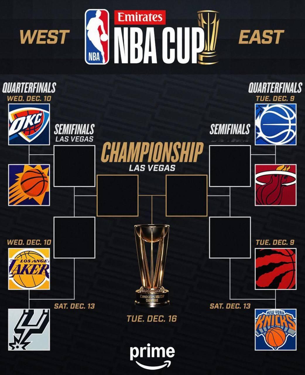 NBA杯四强资格赛12月10、11日开打,对战组合为、、、,八队争抢前进拉斯维加斯准决赛与每人最高53万美元奖金机会。雷霆目前23胜1败只要再赢太阳,就能追平2015–16勇士24战23胜开季纪录,亚历山大在杯赛累计445分史上仅次字母哥453分,联盟也宣布本季杯赛小组赛美国收视超过4000万人次、较去年成长约9成。