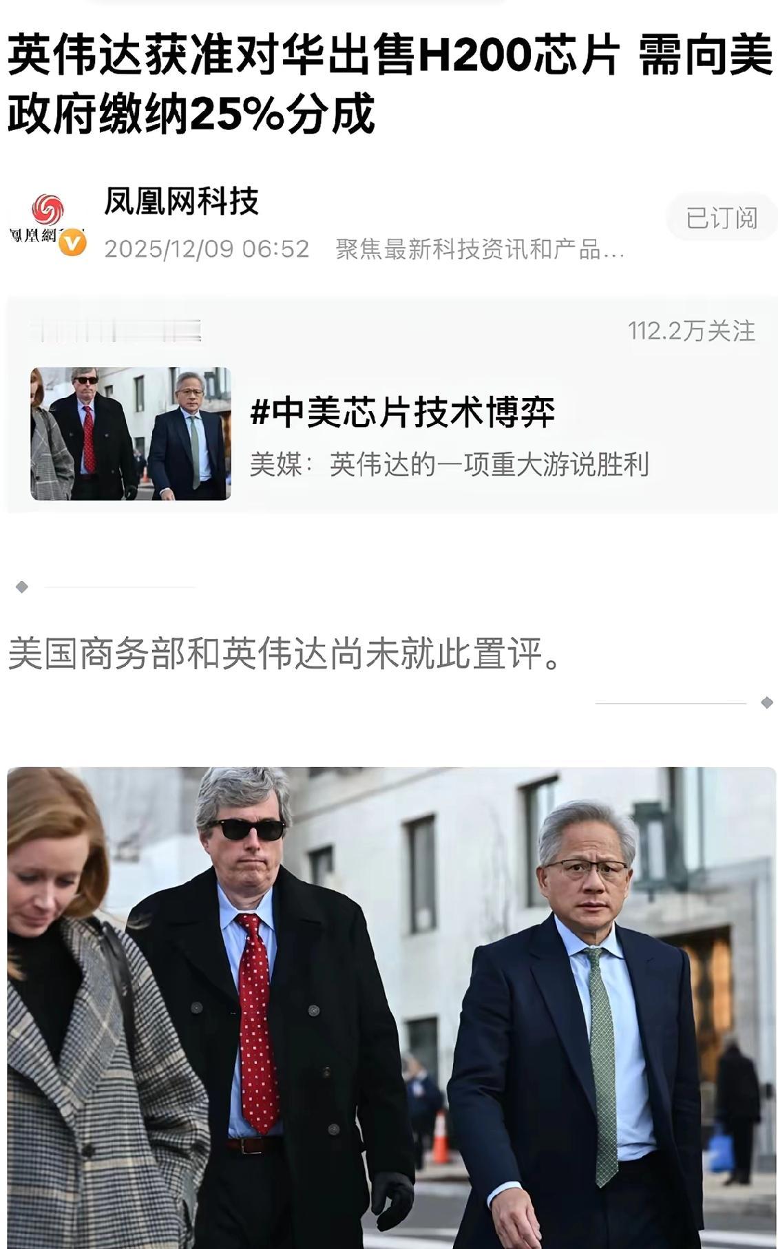 芯片圈这下又有大动静了!英伟达忙活了大半年,总算能把H200芯片“卖回”中国市场了,可这过程里藏着个狠条件——每卖一块H200,就得给美国政府交25%的“过路费”。黄仁勋这半年算是没白拼,连特朗普都点头松了口。 要说这事最关键的,倒不是英伟达能赚多少钱,而是美国对芯片出口的严格管制,终于裂开了道缝儿——所谓的“熊猫市场”,开始有了“有限度开放”的苗头。你可能会说,这哪像是正常做生意,简直就是明摆着抢钱啊!但换个角度想,这其实是个“破冰”的信号。连最硬的管制都松了口,说明中国市场的吸引力谁也挡不住。现在抽成狠归狠,等以后咱们自己的技术真能顶上去了,看谁还愿意当这个“冤大头”? 最有意思的是特朗普居然松了口,说到底还是商人出身的总统会算账:与其眼睁睁看着中国自己搞研发,不如先从咱们这儿“薅一把羊毛”。大家觉得,这25%的“过路费”,到底算不算美国变相认怂呢?