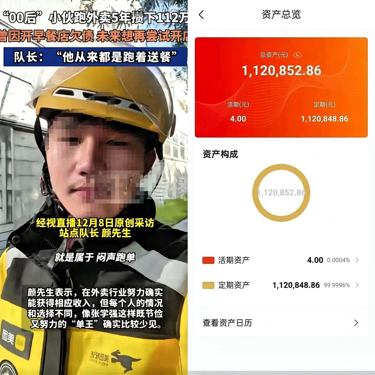 果然是行行出状元! 上海一位00后小伙跑外卖,一开始,他只是为了还债,可跑着跑着就成了“单王”,五年时间里竟然攒下112万。 你们也都别再抱怨赚钱难了!只要足够努力,一切皆有可能,不是赚不到,而是还没有被逼到绝境而已啊。 有人质疑这到底真的假的,小伙子直接晒出账单流水,狠狠打了质疑者的脸,人家这哪里是运气,分明是把时间和自律用到了极致。 很多人算着“一小时13单”觉得不可能,却忘了外卖收入从不是平均分配。 旺季、恶劣天气的补贴,节假日冲单奖励,能让单日收入直接翻倍,而他把别人休息、摸鱼的时间全都用来跑单。 每天从上午10点干到凌晨1点,全年几乎无休,就连送餐都始终在抓紧时间跑着送,却坚持睡足8.5小时时刻让自己保持精力,生活节俭到只留必要开支。这份清醒和坚持,比任何捷径都管用。 其实赚钱的逻辑从来没变:把别人熬不住的苦扛下来,把别人做不到的自律坚持到底,平凡岗位也能跑出开挂人生。外卖小哥 外卖从业者收入 外卖员收入 跑外卖收入