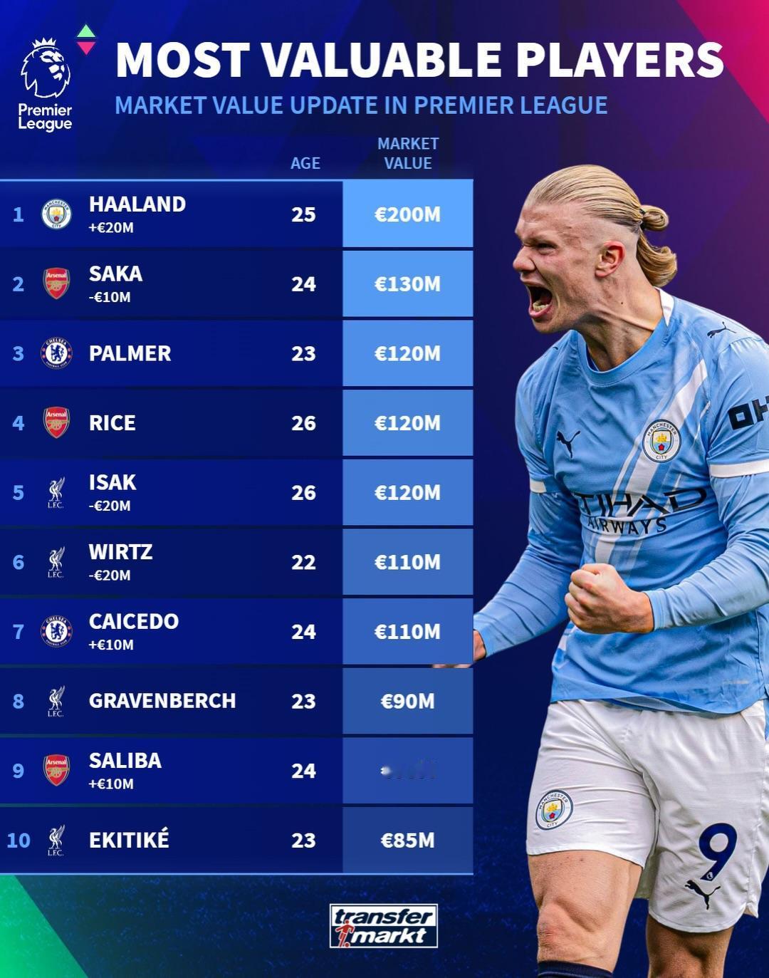 德转最新英超球员身价出炉,前十名身价球员被除了曼联和热刺之外的传统BIG6球队包圆了! 其中卫冕冠军利物浦几乎占据了半壁江山,有六名球员上榜。分别是并列第三的伊萨克(1.2亿欧元),第6的维尔茨(1.1亿欧元),第8的萨拉芬贝赫(9000万欧元),并列第10的埃基蒂克、索博斯洛伊和麦卡利斯特(8500万欧元)。 本赛季占据榜首的阿森纳有三名球员上榜,分别是第二的萨卡(1.3亿欧元),并列第三的赖斯(1.2亿欧元),第九的萨利巴(9000万欧元)。 同样有三名球员上榜的还有目前排名第5的切尔西,分别是并列第三的帕尔默(1.3亿欧元),第7的凯塞多(1.1亿欧元),并列第十的恩佐(8500万欧元) 目前排名第二的曼城虽然只有一名球员上榜,但是却是身价断层领先的第一名哈兰德。两亿欧元的身价领先第二名萨卡7000万欧元,英超第一巨星的名头实至名归。 纵观这四支球队本赛季的表现,除了入选球员最多的利物浦比较拉胯之外(英超排名第10),其他三支球队仍然处于争冠行列。 由此可见,兵贵精而不贵多,身价终究不能代表一切!