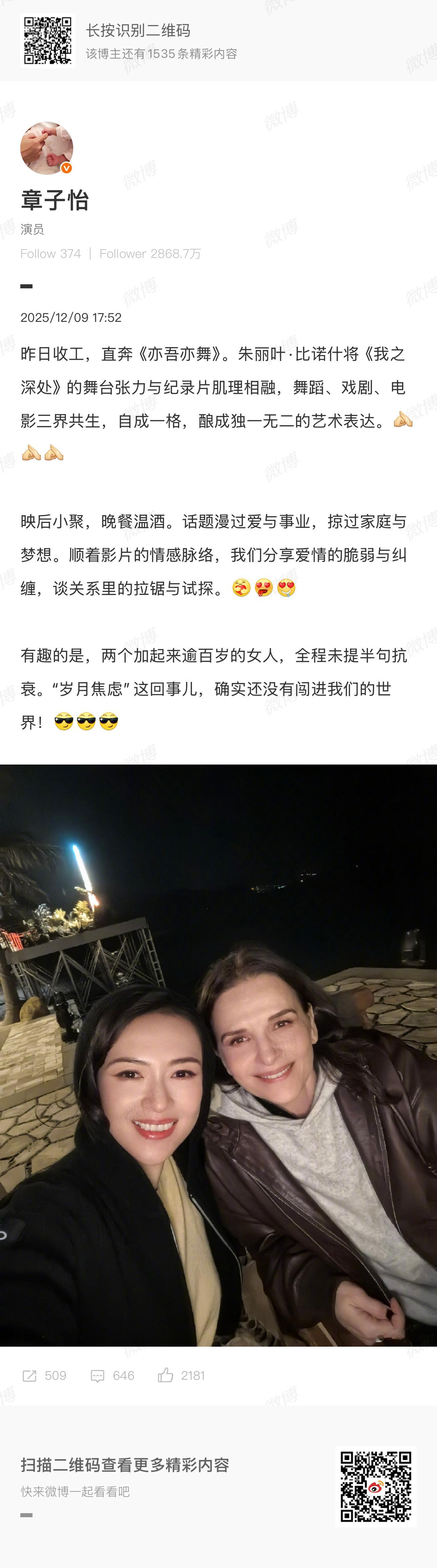章子怡比诺什合照章子怡 岁月焦虑还没闯进我们的世界 章子怡发博晒与朱丽叶·比诺什合照:“映后小聚,晚餐温酒。话题漫过爱与事业,掠过家庭与梦想。顺着影片的情感脉络,我们分享爱情的脆弱与纠缠,谈关系里的拉锯与试探。有趣的是,两个加起来逾百岁的女人,全程未提半句抗衰。岁月焦虑这回事儿,确实还没有闯进我们的世界! ”