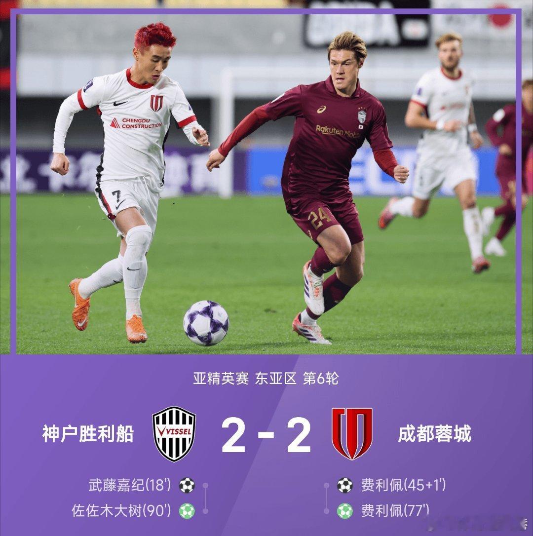 韦世豪造点韦世豪在下半场造点,费利佩点进帮助成都容城2-2战平神户胜利船。