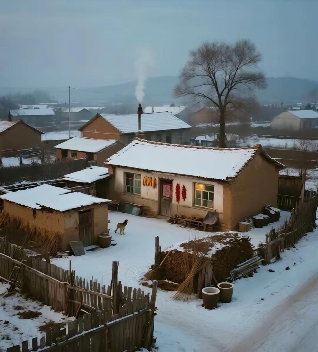 冬日乡村的宁静与温馨,烟囱冒出的炊烟,狗儿在雪地中漫步,岁月静好。