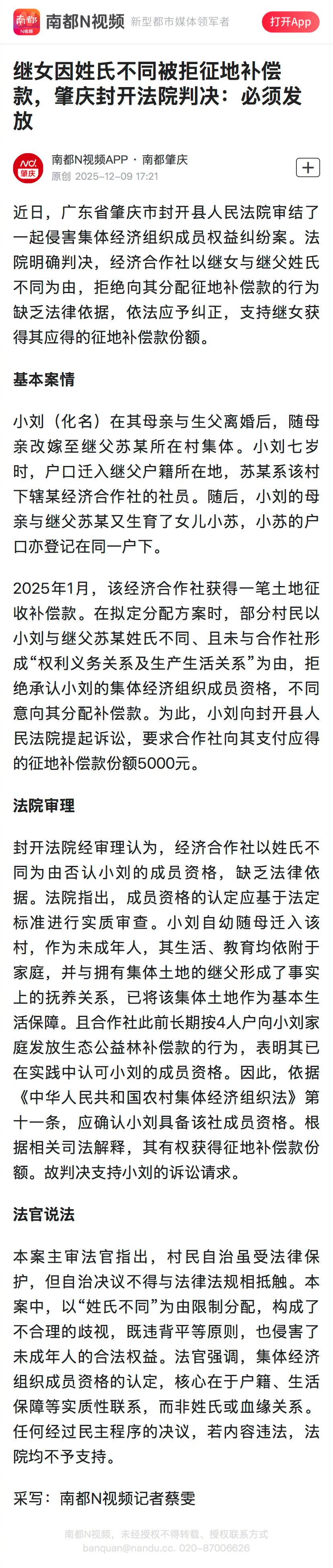 【#继女因与继父姓氏不同被拒发征地款# 肇庆封开法院判决:必须发放】#法院明确姓氏不同不影响集体成员资格#近日,广东省肇庆市封开县人民法院审结了一起侵害集体经济组织成员权益纠纷案。法院明确判决,经济合作社以继女与继父姓氏不同为由,拒绝向其分配征地补偿款的行为缺乏法律依据,依法应予纠正,支持继女获得其应得的征地补偿款份额。南都N视频记者蔡雯