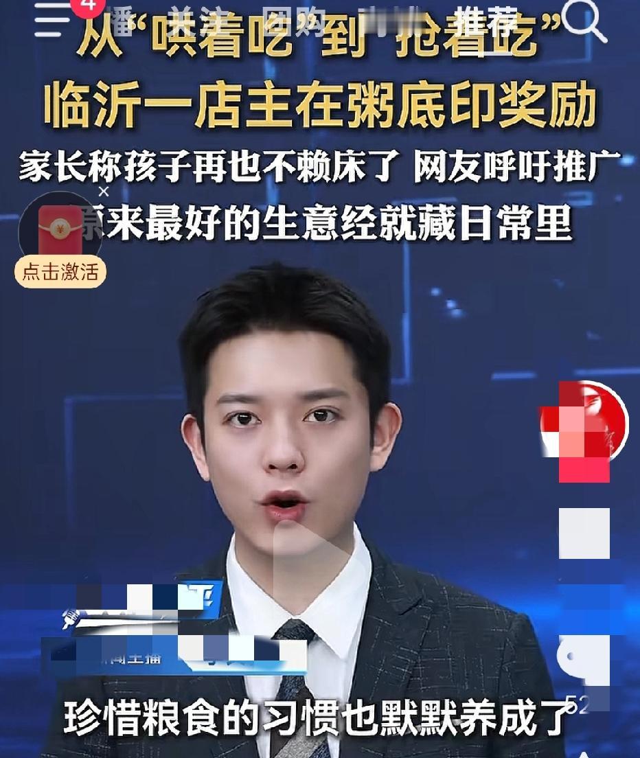冬天叫娃起床吃早餐,简直是家长的年度渡劫现场!临沂这家早餐店的操作,直接把“鸡飞狗跳”变成了“皆大欢喜”。 老板就往粥碗底印了“烤肠一根”“苏打水一瓶”的小奖励,只有喝光粥才能兑奖,没想到直接治好了娃的赖床病。 以前要哄要催还不吃,现在孩子主动爬起来,就为了去解锁碗底的“盲盒惊喜”,连粮食都不浪费了。 这哪是做生意,分明是读懂了家长的痛点和孩子的心思!比起花大价钱搞营销,这种藏在日常里的小巧思才最戳人。 它不只是卖一碗粥,更是给早餐加了份快乐buff,让平淡的早晨多了期待感。 真正的经营智慧,从来不是复杂的套路,而是把用心融进细节里。你家娃有赖床吃早餐的烦恼吗?早晨叫孩子起床 家长做早餐 早晨叫孩子