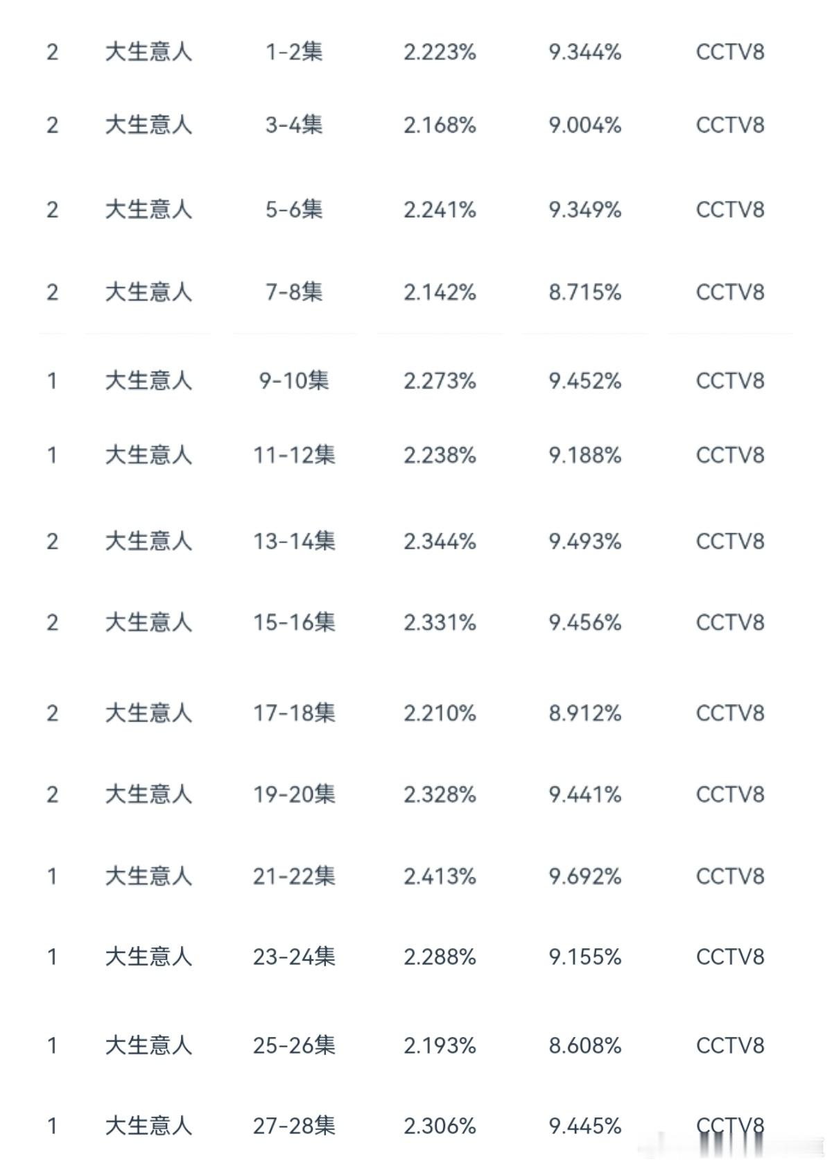 大生意人cvb前28集集均收视率2.264%,基本稳住了趋势,预估最终差不多能到2.3%。