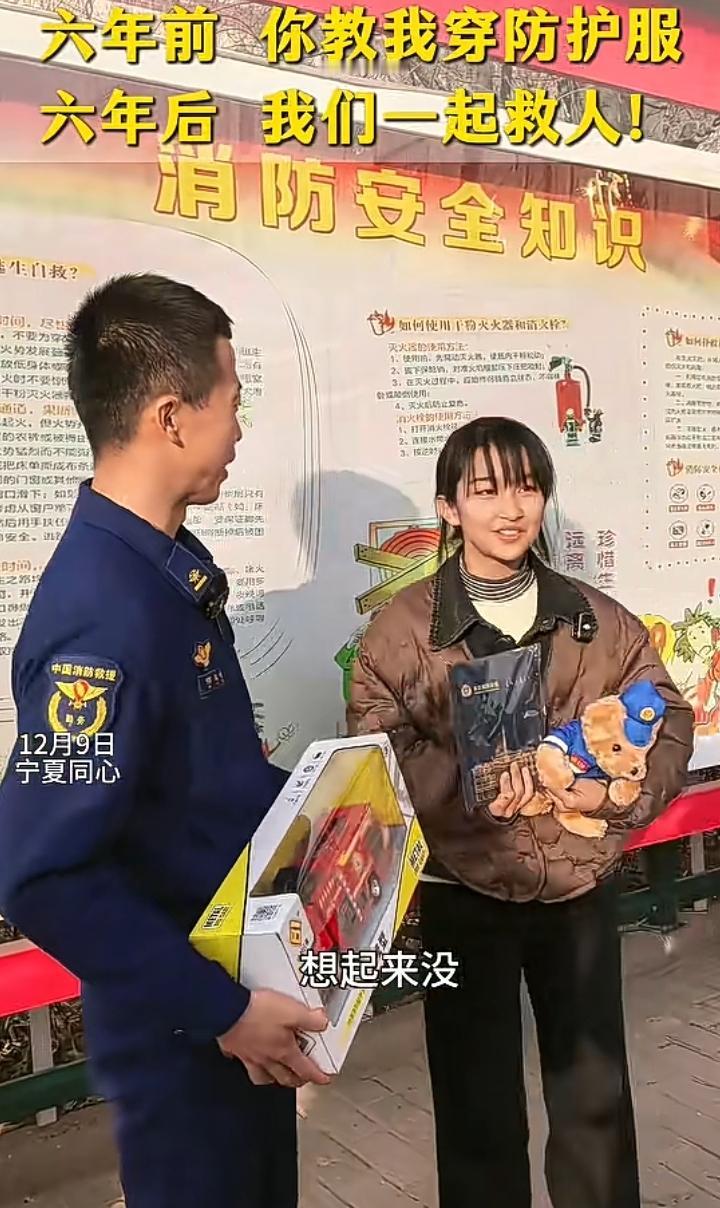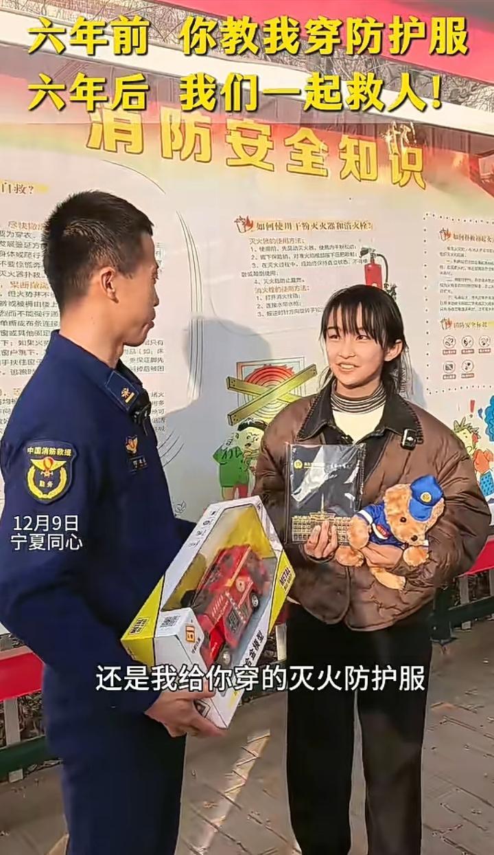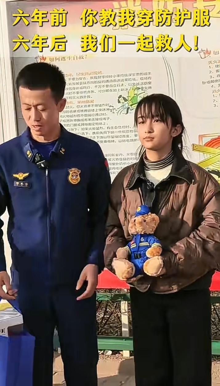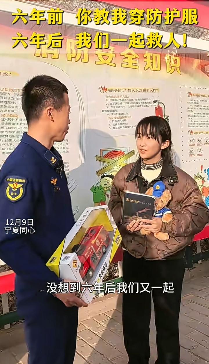 万万没想到,宁夏同心县李佳婷和消防员还有这么一段源缘,六年前她去消防队,是何先生给她穿的灭火防护服,六年后她先去救援了小男孩,紧接着是何先生接力救援,在现场他没有认出李佳婷,后来在网上看新闻,无意间发现这不就是六年前来消防队的小女孩吗?此刻或许把源缘解释的具象化了。 那时候的李佳婷穿上防护服俨然像一个小大人,虽然个头并不高大可气势非凡,谈不上英姿飒爽气宇轩昂最起码像模像样,原来在很小的时候就把舍己救人这一理念深深的烙进了脑海里,才会在救援现场迸发出毫不犹豫的巾帼本色,一切或许是天意也许冥冥之中依然注定。 你舍己救人的模样很美,它像一道光刻进了每个人的心里,也温暖了这个冬天,最后消防员寄语:无论在任何情况下,都要保护好自己才是第一位,你是好样的。