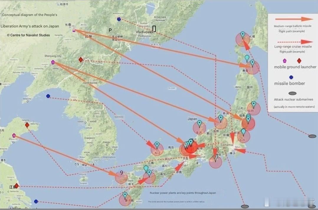 有人热情洋溢帮我们准备了一张对日打击的详细地图,显示了攻击轨迹,包括四岛的各潜在目标,包括核电站以及设有潜艇停泊的海军基地。实线是中程导弹,虚线是远程导弹,甚至还包括了外海的打击点。事实上作为第一轮,还少了无人机的打击,为了保证一击必杀,必须组织上千枚导弹和数万架各型号无人机一起上阵。国际军事