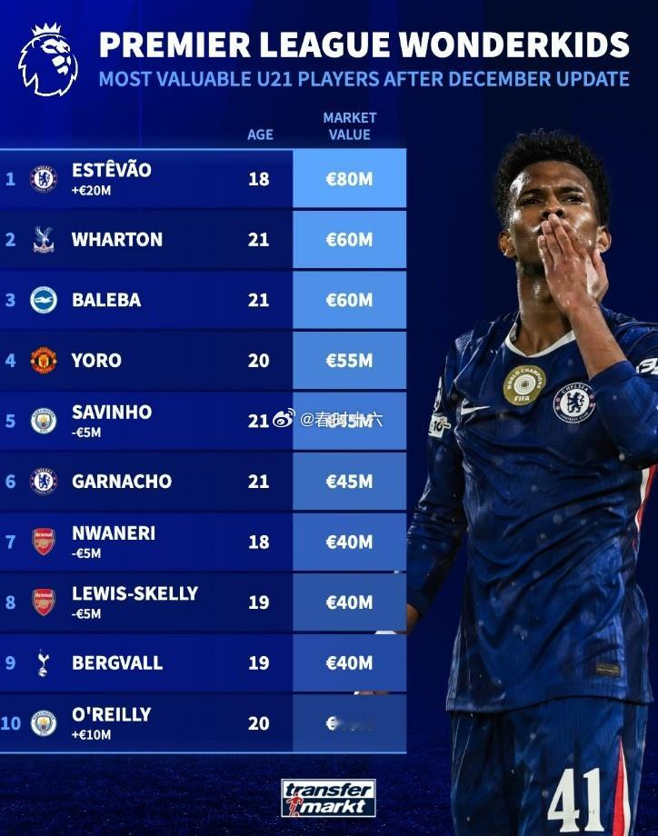 英超U21球员身价榜:埃斯特旺8000万欧居首,约罗、加纳乔在列 、12月9日讯 德转更新了英超球员身价,并盘点了目前U21球员身价榜,具体如下:1、埃斯特旺(切尔西),18岁,8000万欧2、沃顿(水晶宫)21岁,6000万欧3、巴莱巴(布莱顿)21岁,6000万欧4、约罗(曼联)20岁,5500万欧5、萨维尼奥(曼城)21岁,4500万欧6、加纳乔(切尔西)21岁,4500万欧7、恩瓦内里(阿森纳)18岁,4000万欧8、斯凯利(阿森纳)19岁,4000万欧9、贝里瓦尔(热刺)19岁,4000万欧10、奥赖利(曼城)20岁,4000万欧