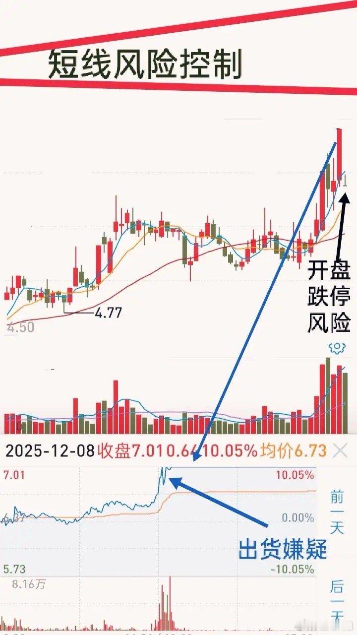 股市变化快,短线追高、打板就算做的是主升浪,风险也大,得学会从容应对。有时候不能按常理判断:主力吸够筹码要出货,可能借势对倒推高股价,花很少成本就能做到。出货后上方套牢盘多,一旦趋势变、上涨没力气,这些套牢盘会像山洪一样砸下来。主力不会接盘,哪怕跌停也可能不承接,股价次日低开甚至直接跌停都有可能,比如下图这只股,前一天午后涨停,今天开盘就跌停。做短线得在昨日复盘分析盘面,像放量突破、三浪后上扬的情况,要做好应激准备:股价涨了怎么应对?关键是股价逆转怎么办,尤其是遇到今天这种跌停开盘的情况。趋势变了,跌停就得认输,不管是低吸还是打板,先出来再看。下跌阶段的个股风险大,趋势逆转的机会少,行情不好时还可能连续下跌,风险更高。看分时图,开盘后有抄底盘打开跌停、拉一波小涨,这就是逃生机会,别管明天怎么样,先避险最重要。另外,常理觉得昨日主力拉涨停,今天成本至少得推平,但融资融券股票不一样,主力用融券拉升,成本可能更低甚至零成本,次日跌停板赎回还能赚一笔。所以做短线,跟着趋势操盘是最好的选择。