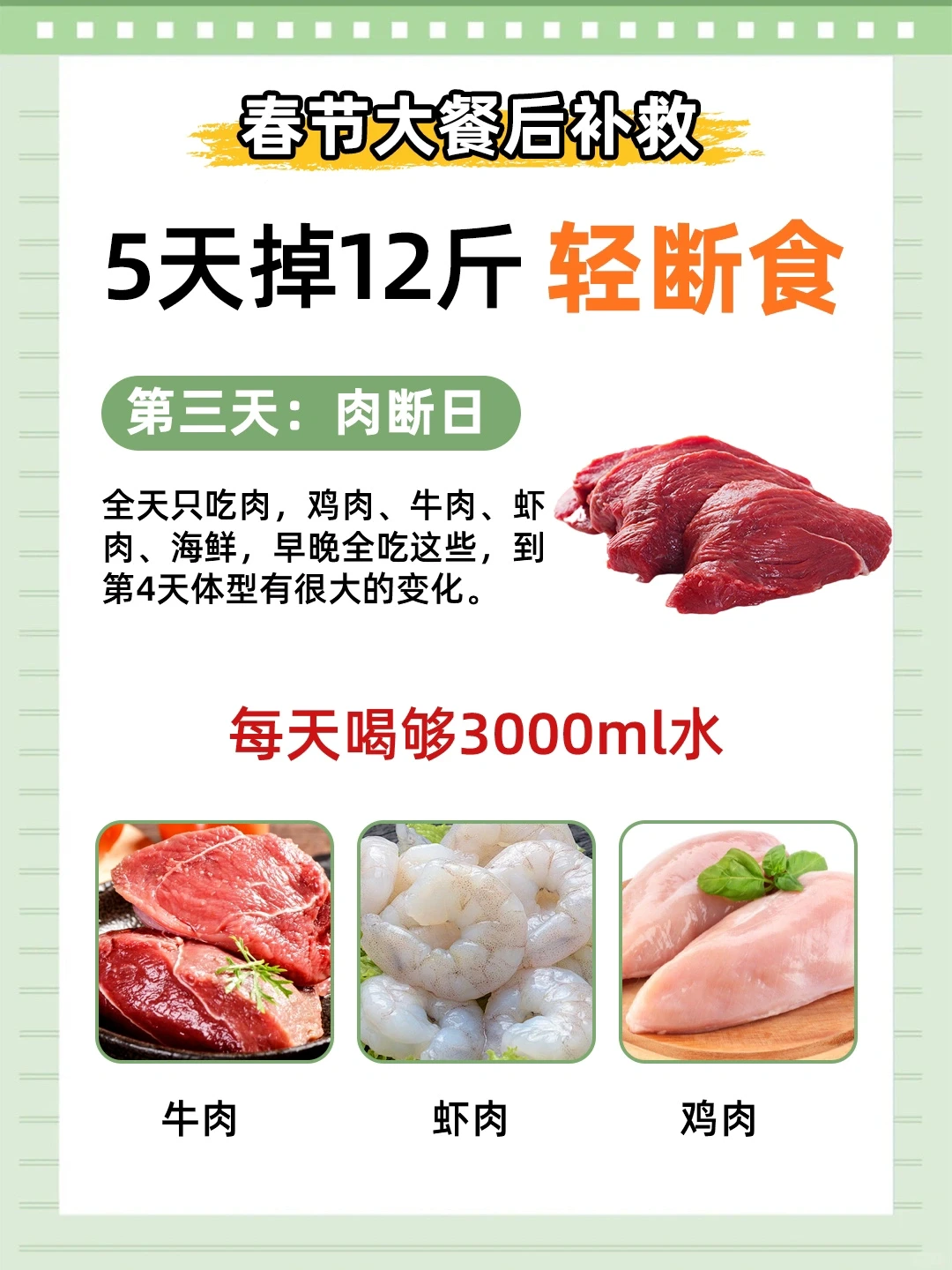 全天只吃肉类,鸡肉、牛肉、虾肉、海鲜,早晚全吃这些。