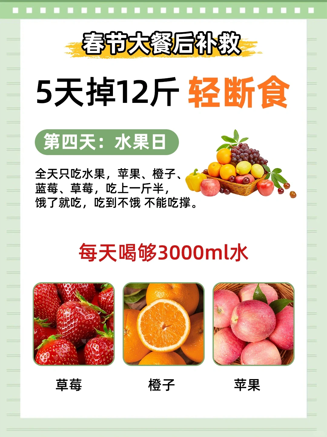 全天只吃水果,苹果、橙子、蓝莓、草莓,吃上一斤半,饿了就吃,吃到不饿,不能吃撑。