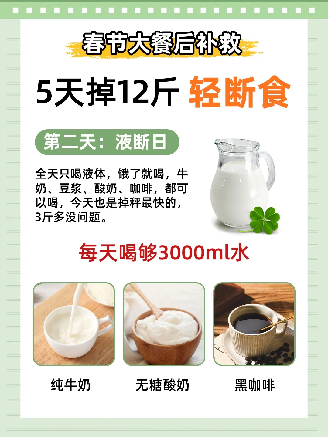 全天只喝液体,饿了就喝,牛奶、豆浆、酸奶、咖啡,都可以喝。