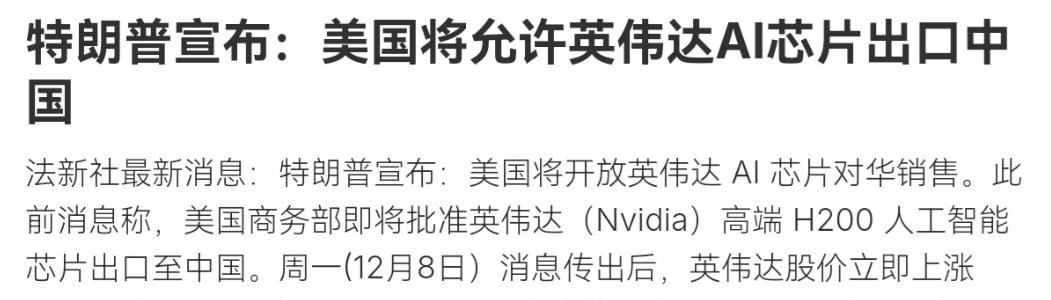 美国对华出现重大让步,中美已经走向事实上的互利共赢之路!12月9日,根据法新社报道,美国总统特朗普亲口宣布,美国将允许英伟达AI芯片出口中国。法媒称,美国商务部即将批准英伟达(Nvidia)高端H200人工智能芯片出口至中国。很显然,特朗普的这一宣布,这意味着美国在技术管制方面出现了重大松动。 这真是大快人心的好事!特朗普宣布允许英伟达H200高端AI芯片出口中国,这绝对是美国对华的重大让步,更是中美走向事实上互利共赢的铁证,想想都让人振奋! 之前美国一直把高端科技当武器,在芯片领域死死卡着中国的脖子,以为这样就能拦住咱们的发展脚步,结果呢?现在还不是乖乖松口,这背后全是现实的必然,也是互利共赢的大趋势挡不住! 谁都清楚,美国之前对高端AI芯片出口中国管得有多严,像H200这种能支撑人工智能发展的关键芯片,之前一直被列在禁售名单里,就是怕咱们用上先进技术。 可现在特朗普亲口宣布放开,美国商务部还要敲定细节,连AMD、英特尔这些公司也能跟着享受这个政策,这不是技术管制的重大松动是什么?这绝对不是美国随便做的决定,而是他们看清了形势,知道再硬扛下去,吃亏的只能是自己。 美国之所以会做出这个让步,核心就是扛不住了!中国市场太大了,对美国芯片企业来说,简直就是不能丢的命脉。 就说英伟达,之前因为美国的封锁政策,在中国的市场份额从95%直接跌到了0%,营收少了一大块,损失惨重到让他们坐立难安。 黄仁勋为啥天天跑到白宫游说?还不是因为中国市场太重要,未来两三年规模就能达到500亿美元,这么大的蛋糕,美国企业怎么舍得彻底放弃? 之前美国想通过封锁让中国科技停滞,可没想到,咱们自己的芯片产业越逼越强,华为、寒武纪这些国产芯片一步步崛起,互联网巨头也都在加大研发投入,就算没有美国芯片,咱们的科技发展也没停下脚步。 反观美国,芯片企业没了中国市场,营收下滑、库存积压,连研发下一代芯片的钱都受影响,这不是搬起石头砸自己的脚吗? 所以说,美国这次松口,根本就是现实逼的,是他们终于明白,封锁中国没用,反而会让自己的企业错失良机,只有合作才能保住自己的利益。 而且这事儿明摆着就是互利共赢,对中美双方都有好处。对美国来说,允许芯片出口,英伟达这些企业能重新拿回中国市场,赚回数十亿美元的收入,企业活了,美国的就业、制造业也能跟着受益,特朗普自己都说这能支持美国就业、惠及纳税人,这就是他们实实在在的好处。 而对咱们中国来说,H200这种高端芯片能进来,能帮着咱们缓解AI研发上的算力瓶颈,推进人工智能、科技产业的发展,让咱们的科技进步更快一步。 更重要的是,这不是谁求着谁,而是双方各取所需,你有先进芯片,我有庞大市场,互补互利,这才是最健康的合作模式。 之前美国总想搞对抗、搞脱钩,结果搞得两败俱伤,现在终于回到合作的正轨上,这就是互利共赢的必然选择。 可能有人会说,美国还要求拿25%的分成,还有“经批准的客户”这种限制,但这根本改变不了这是重大让步的本质。 就算有这些附加条件,也说明美国已经放弃了之前那种全面封锁的思路,转而寻求有条件的合作,这本身就是态度的巨大转变。 他们之所以加这些条件,无非是想多赚点钱,还想维持所谓的“国家安全”面子,但实际上,他们心里比谁都清楚,能和中国合作、能保住中国市场,才是最关键的。 黄仁勋都坦言不确定中国会不会接受,这说明咱们现在有了更多选择权,不是以前那种被动等着要芯片的状态了,这也是美国不得不让步的重要原因——他们怕再不让步,中国市场就彻底没他们的位置了。 外交部也说了,中方一贯主张中美通过合作实现互利共赢,这正好印证了咱们的立场。 中美作为世界上两个大国,在科技、经济领域有着千丝万缕的联系,合则两利、斗则两伤,这是铁打的道理。 美国之前的科技封锁,既没能拦住中国发展,反而让自己的企业受损,让全球产业链受影响,现在终于醒悟过来,放开芯片出口,就是顺应了互利共赢的大趋势。 这事儿更说明,互利共赢才是中美关系的唯一正确出路。美国之前总想用技术优势压制中国,可事实证明,中国的发展不是谁能拦住的,而美国企业也离不开中国市场。现在美国做出让步,就是承认了这个现实,也让中美关系朝着更健康的方向发展。 未来,随着合作的深入,双方还会在更多领域实现共赢,因为只有尊重彼此、平等合作,才能让两国都受益,让全球经济、科技都能更好地发展。 总之,特朗普允许英伟达H200芯片出口中国,绝对是美国对华的重大让步,更是中美走向互利共赢的有力证明。 这背后是中国市场的强大吸引力,是中国科技发展的硬实力,更是互利共赢大趋势的必然结果。 那些想搞对抗、搞封锁的想法,终究抵不过现实的需求,只有合作共赢,才是符合两国利益、符合时代潮流的正确选择,这个趋势谁也挡不住!