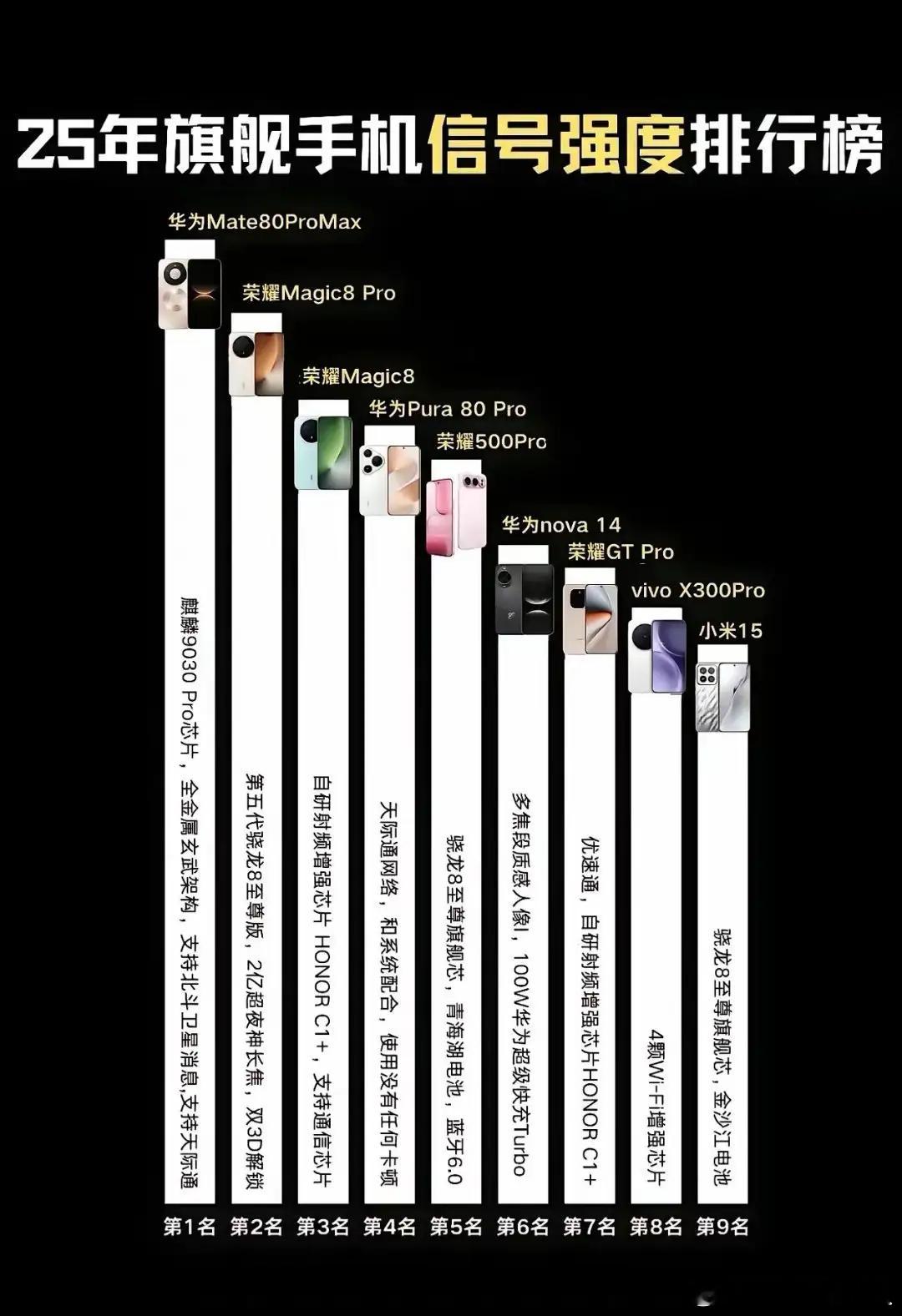 这个排行是真没毛病,最近这些手机我大多都试过,不管是坐高铁穿山洞,还是到海上,能最先接上信号的,还就得是华为和荣耀,通讯这块老本行确实扎实。最近测了回去涠洲岛的船上信号,华为Mate80系列接入是真快,荣耀紧跟着也不差,垫底的居然不是苹果,至于是谁,我可不说