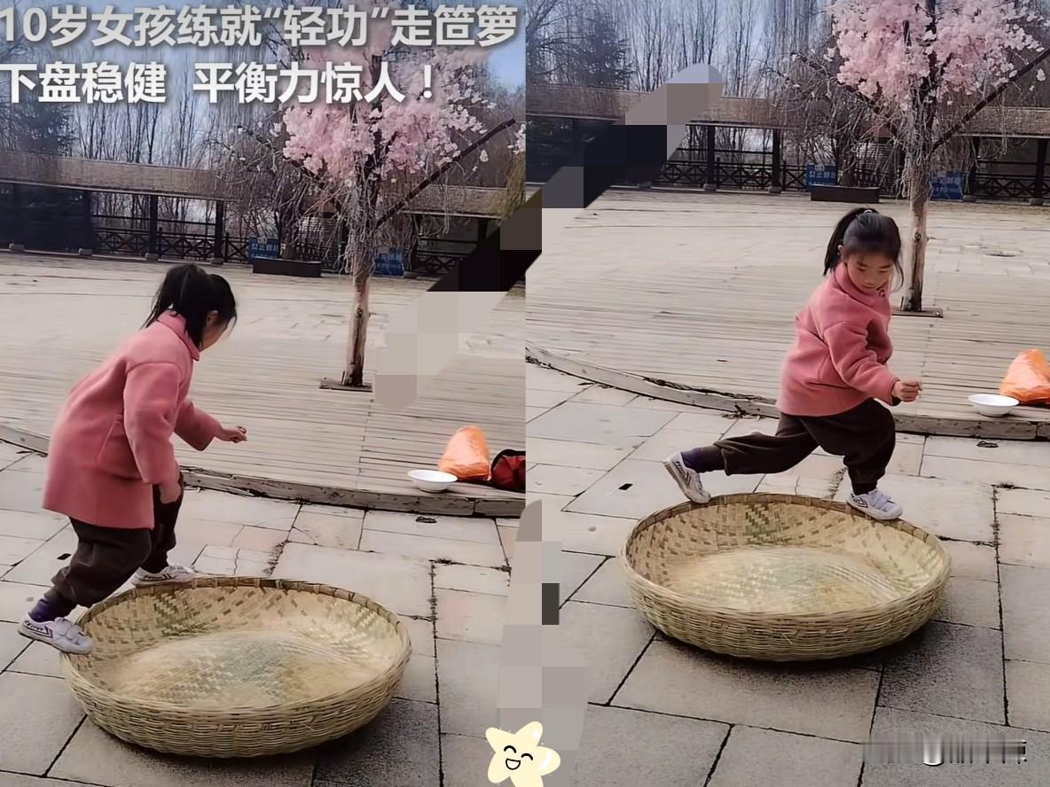 上人民日报了!贵州一10岁女孩练就“轻功”,直接在笸箩上走,笸箩竟然没有翻,下盘稳健、平衡力惊人!接着 女孩围着笸箩继续走 软塌塌的竹笸箩,边缘薄得像纸片,普通人脚尖刚碰就翻车,她却纵身一跃稳稳站上! 张开胳膊当平衡杆,围着晃得“咯吱响”的笸箩走了三圈,还踮脚转了个圈,落地时稳得不像话! 这哪是什么“趁笸箩不注意”,分明是自然门“簸箕功”的真本事! 背后是扎扎实实扎了一年马步的下盘功底,是脚找劲、手调重心的精准把控! 传统功夫从不是玄学,是日复一日的打磨,是藏在民间的文化传承! 老祖宗传下来的绝活,就该这样被看见、被传承!你觉得这种传统功夫该不该纳入青少年课外体验?