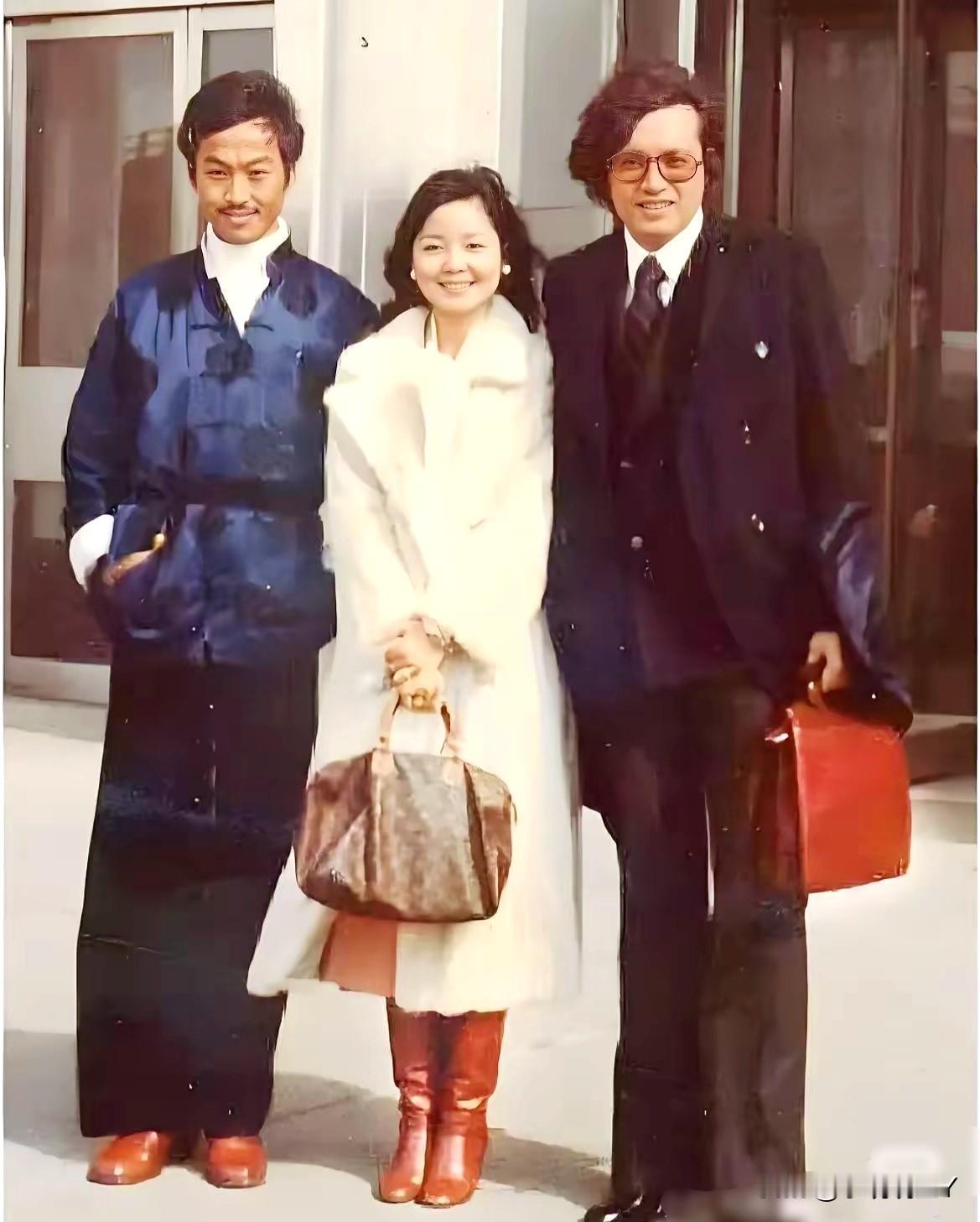 这是一代歌后邓丽君与秦祥林和谷村新司在美国的一张合影老照片,拍摄于一九七八年。彼时邓丽君二十五岁,站在两位男士中间,气质优雅,笑容甜美。在看看她的穿着打扮,果然时尚是个轮回!