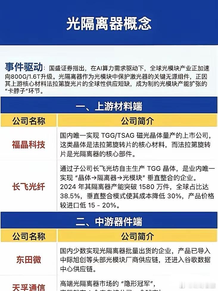 AI算力的隐形心脏:这款“光交警”短缺,全球数据中心或将停摆【核心标的梳理】这不是科幻——当英伟达创始人黄仁勋警告“能源是AI死穴”时,另一场围绕光信号“交通警察” 的隐形争夺战,已在全球AI算力供应链的毛细血管里打响。这个学名为 “光隔离器” 的关键器件,体积微小,却是光模块必须的“安全阀”。它能精准阻断高达10%的反射光信号回传,保护价值不菲的激光器芯片,确保AI服务器内的数据高速、无损地“奔流”。缺了它,整个高端光模块产线就会停摆。然而,它正面临供应瓶颈。AI算力需求的爆炸性增长,已传导至上游光模块,并进一步挤压这些核心元器件的产能。巨头动向提供了明证:行业龙头Lumentum 在近期大会上坦言,OCS(光电路交换)的需求超出预期,公司正面临巨大的交付压力。博通已证明其硅光技术是未来趋势,而这需要更精密、更可靠的光隔离解决方案。全球AI军备竞赛的背后,不仅是芯片的比拼,更是这些基础光学元件的无声较量。谁能稳定、高效地掌握这颗“隐形心脏”的供应,谁就可能在下一代AI基础设施的竞争中,提前锁定胜局。