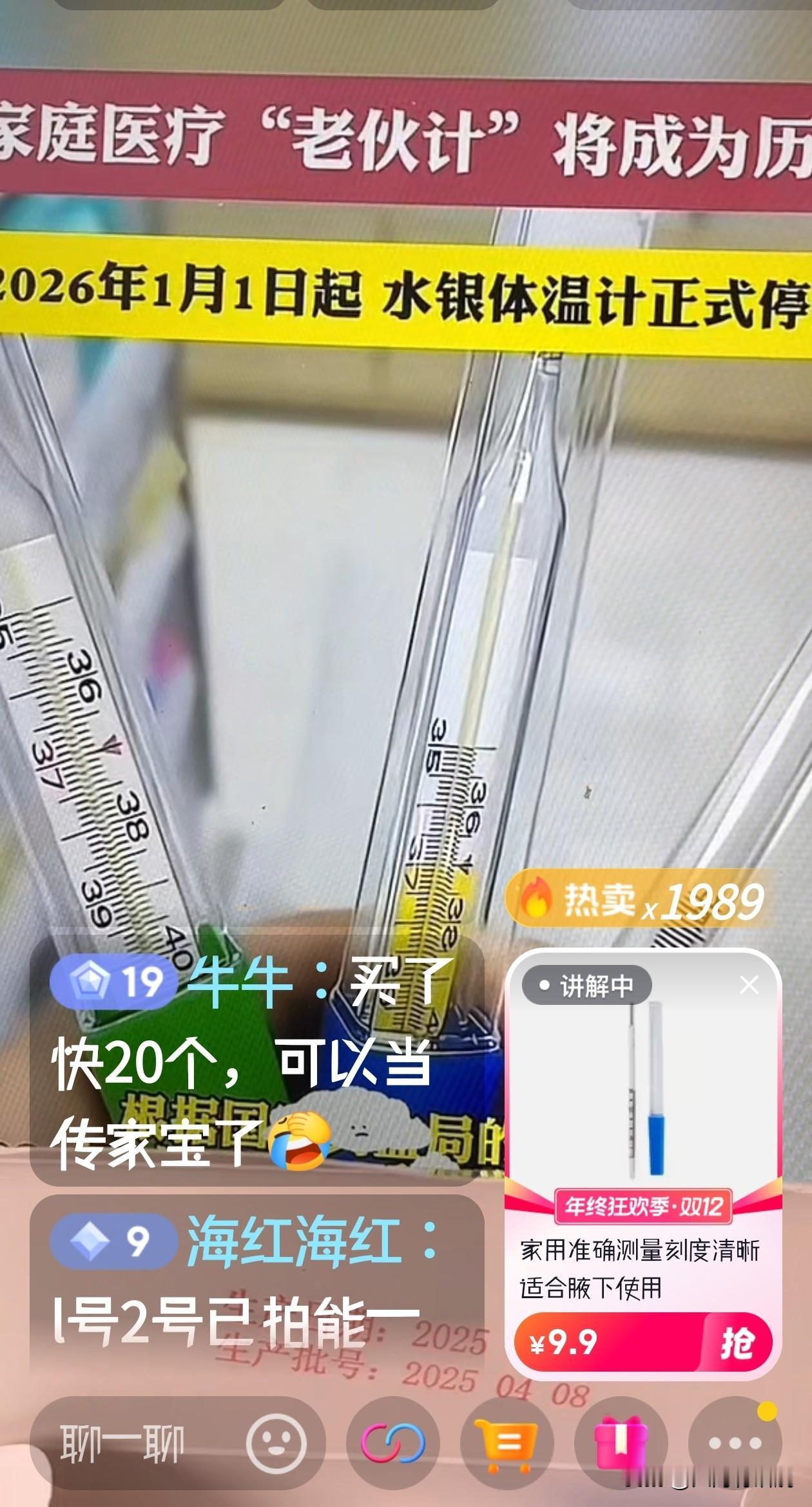 夸张!有人买了20个,水银温度计将被禁止生产的消息一出,很多人就开始脑补,生怕自己吃亏,真的是有点杞人忧天! 也不知道谁在乱带节奏,水银温度计价格被炒到提升了3倍,平时一个卖五六块钱的东西,现在网上22一个没货。 还有商家开始清理库存开直播带货,直播间里疯抢,有人屯了20个当传家宝。 首先,水银温度计虽然测的准,但它费时且不环保,以后终将要被淘汰。 其次,市面上已经有电子的和更环保的温度计来选择,而且更快更安全。完全不用担心,更不用慌张。 再者,温度计的作用就是测体温,只要知道自己的体温是正常的还是发烧了就可以了,没必要去纠结那零点几的误差。 这一幕让人想起了几年前的口罩,冲动过后都是后悔。 你们觉得温度计该不该抢?