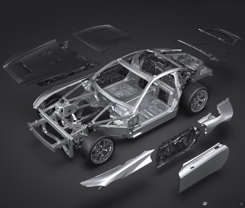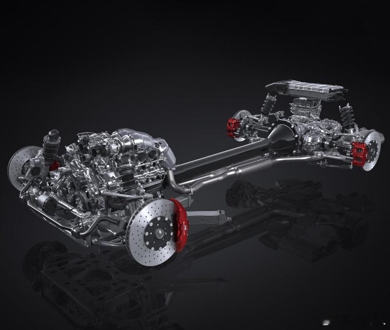 重点来了,丰田GR GT有一个特别牛逼的技术,就是后方 transaxle 一体化单电机混合系统,里面包含了 8 速自动变速器,什么意思?就是丰田为了实现更完美的重量配比和动力响应,直接把这台8速的箱子+电机集成在了后桥上,没见过吧,也就是说直接把传统的发动机和变速箱分离了,原来传动轴是变速箱的输出端,现在成了变速箱的输入端了,前面就剩一台V8了,transaxle翻译过来就是变速驱动桥,这里面集成了变速箱、电机和差速器,这个电机离后轮非常近,几乎可以瞬间把动力送到后轮,比传统发动机通过长传动轴和多级齿轮传递扭矩快得多,这样一来点击就能独立调控后轮扭矩,在弯道加速或出弯时瞬间补扭矩避免打滑,同时还能在制动时又快又高效地回收能量并辅助制动,因为主动力还是V8,电机起到了削峰填谷的作用,既避免了电机的过热,又能发挥最大优势,简直是顶级设计,所以直接颠覆了现在的什么P1P2P3P4电机混动结构,人家不和你这种低效结构玩儿了。丰田给这套系统的目标输出是 650 PS 以上最大功率和 850 N·m 以上的峰值扭矩,最高速 320 km/h 以上。丰田丰田gr丰田grgt跑车性能车跑车-资讯超级跑车跑车丰田新车新车新车资讯新车新车变速箱变速驱动桥