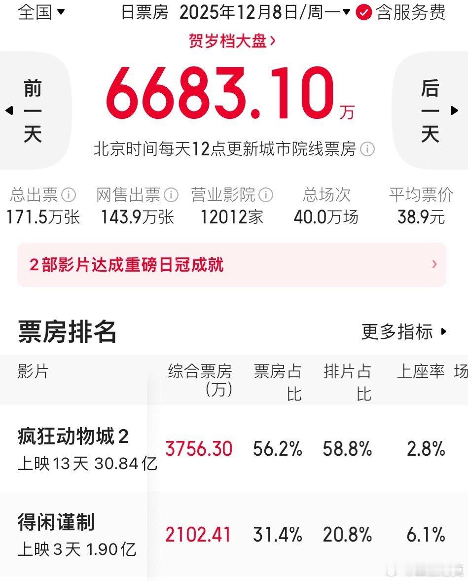 《疯狂动物城2》今天继续倒挂(票房占比小于排片率),已经连续两天倒挂了。还在倒挂的不多。而且,《疯狂动物城2》连着两天票房不及预测(单日票房)。目前的预测票房也从39亿下调至38亿,今天已经下调至37亿多了。《疯狂动物城2》还有一个周末的双休两天可以“疯狂”。票房破40亿还是有点希望的。